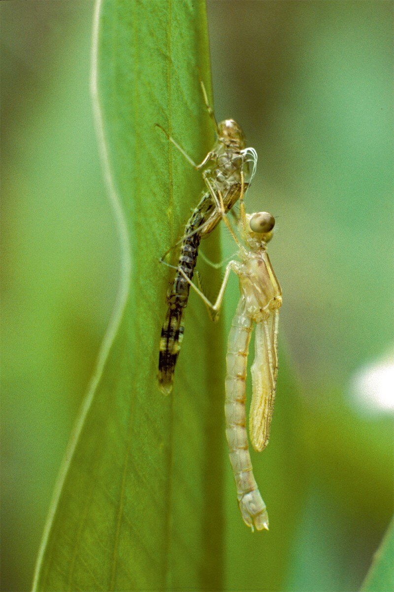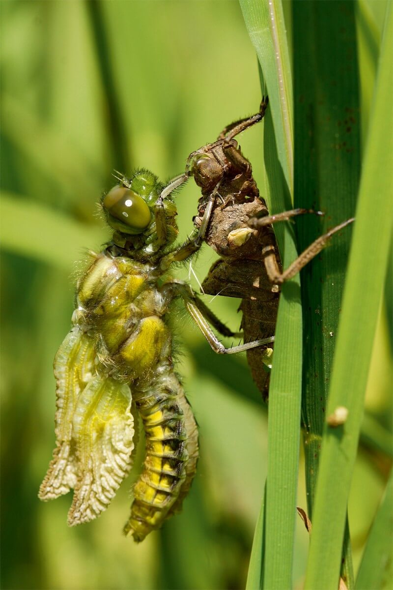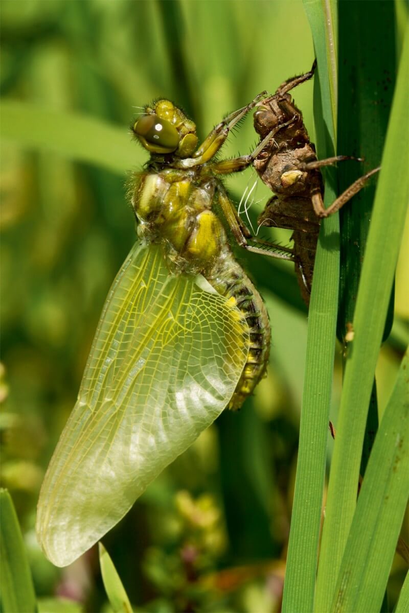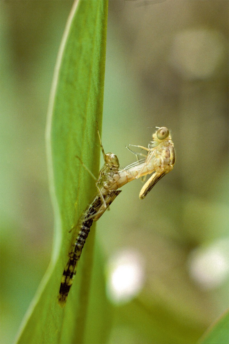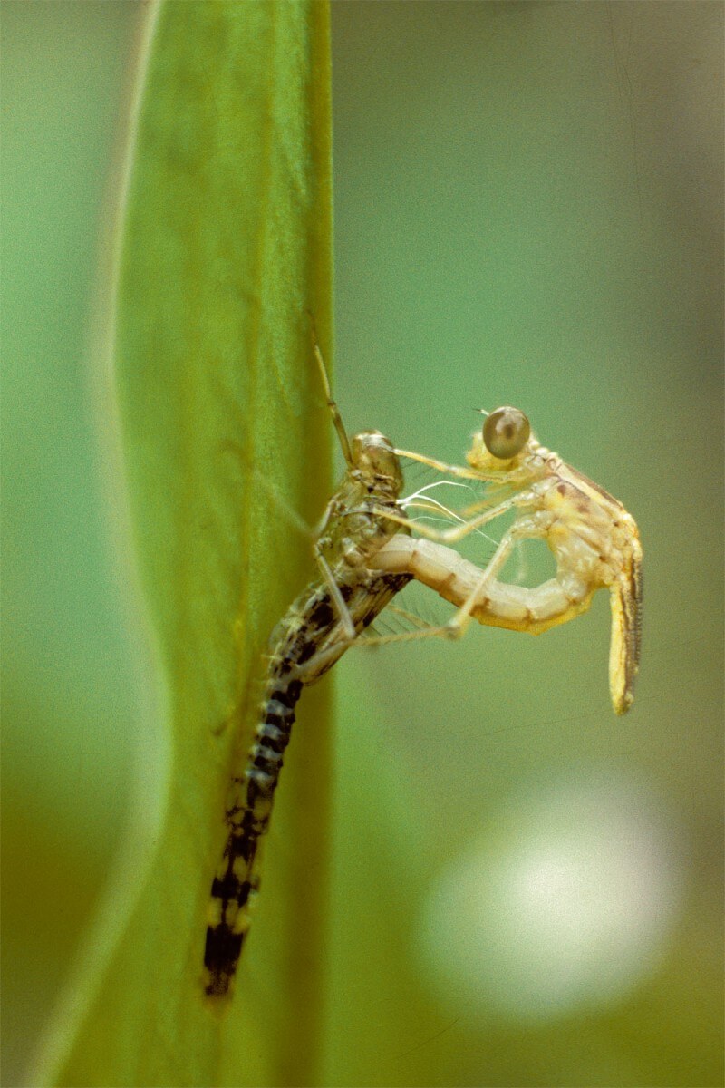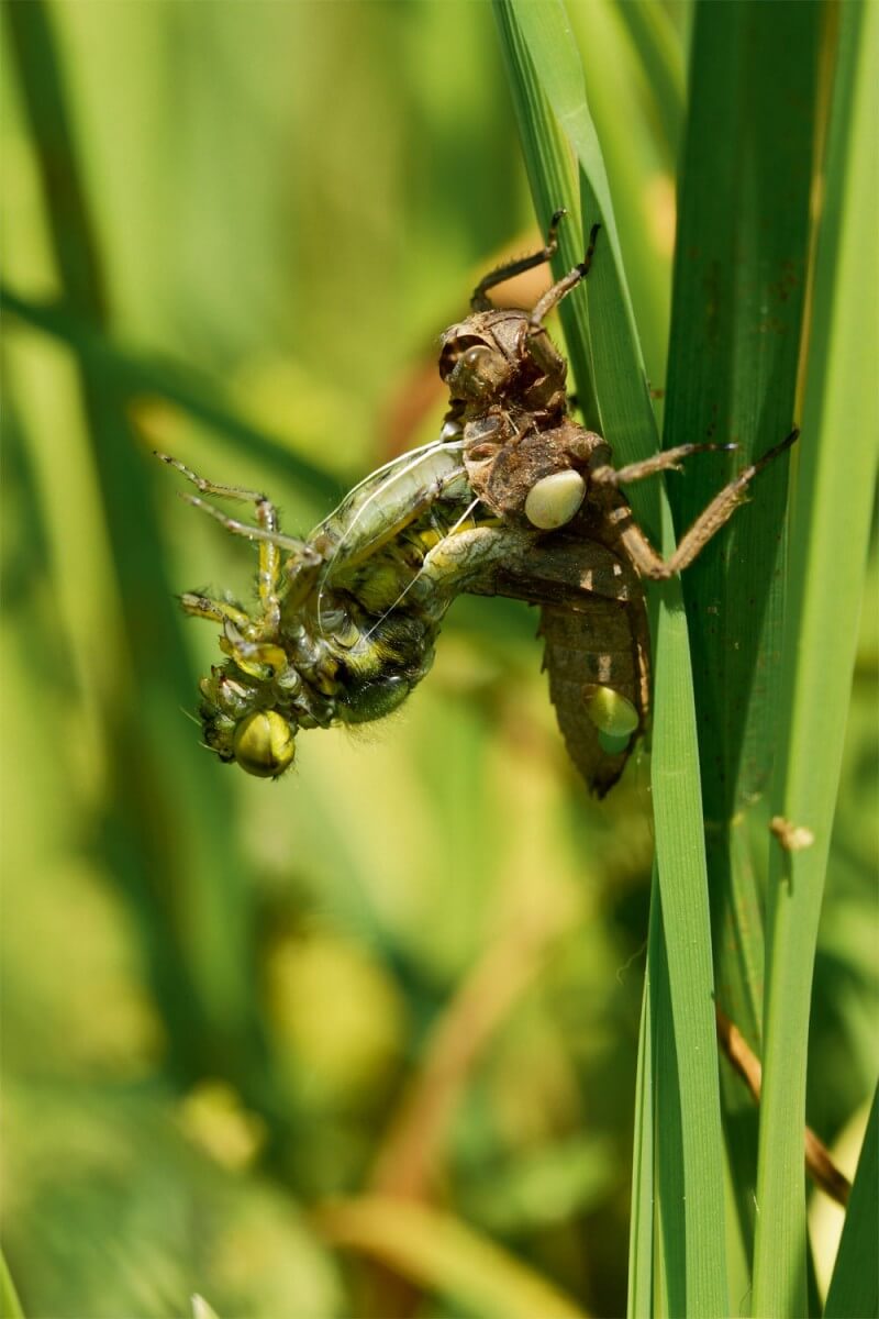 Une fois le processus d'émergence enclenché, tout retour en arrière est impossible. Le squelette externe de la larve se fend derrière la tête. L'insecte encore immature s'extrait petit à petit de sa dépouille larvaire, l'exuvie. Incapable encore de prendre son envol, il est à la merci des prédateurs.