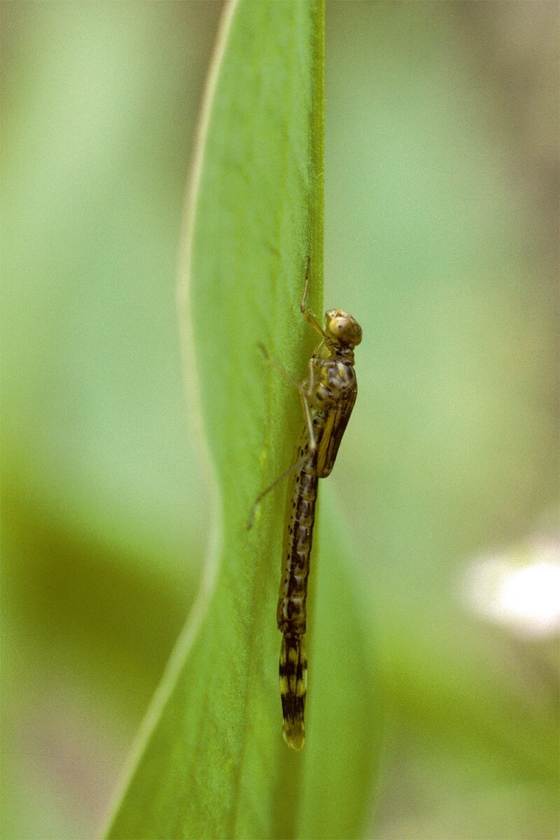 Tous les odonates n'adoptent pas le même style lors de l'émergence. Les demoiselles, comme ce leste, se contorsionnent pour faire sortir leur long abdomen en gardant la tête bien droite.