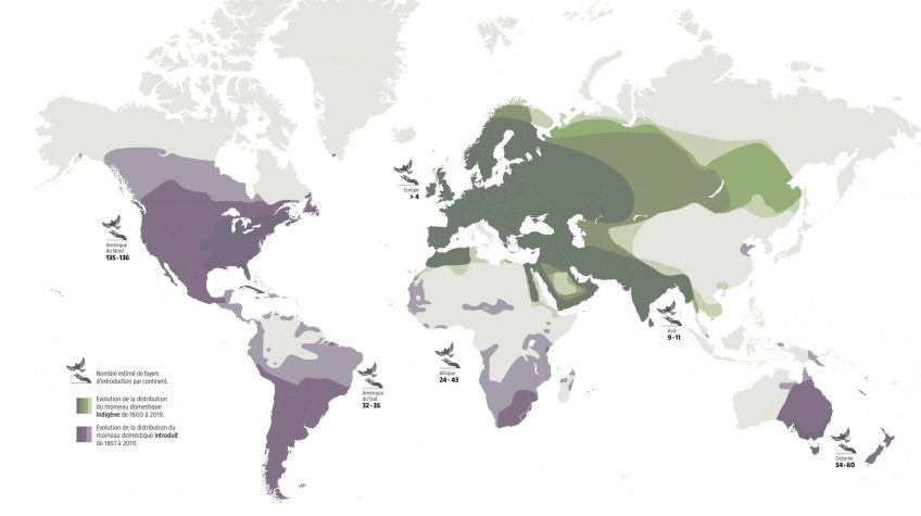 Il est le volatile sauvage le plus répandu sur Terre. Indigène ici, introduit ailleurs, le moineau domestique colonise tous les continents sauf l’Antarctique. Dernière mise à jour d’une progression galopante.