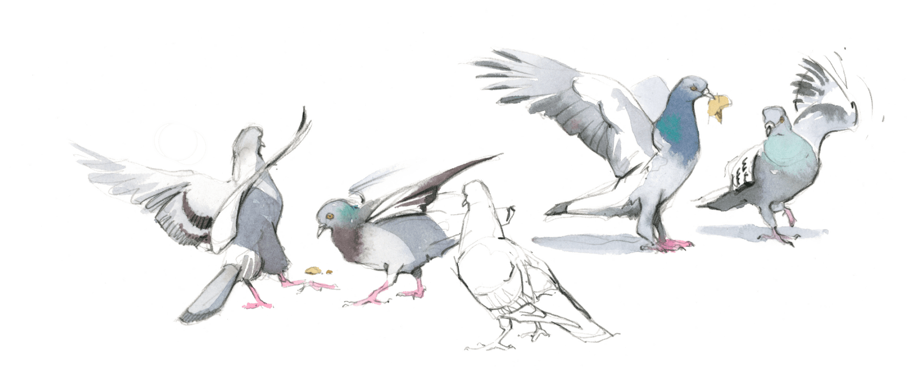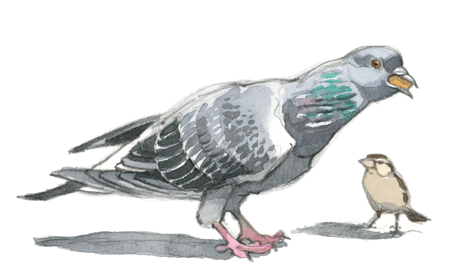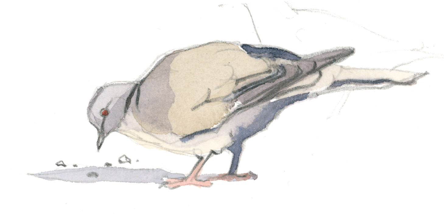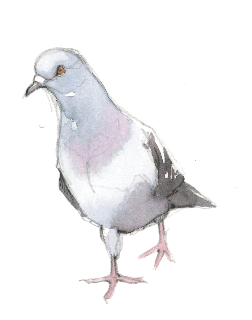 L'agitation et les piaulements des moineaux sur la terrasse du bistrot attirent l'attention des maîtres de l'air citadin. Quelques pigeons bisets, visiteurs fidèles des lieux fréquentés par l'homme, rejoignent le petit café d'un vol en piqué depuis le haut du clocher. Ils avancent sous les chaises en évinçant les moineaux grâce à leur taille imposante. Sans jamais s'arrêter, ils picorent les miettes en hochant le cou comme des jouets rechargeables.