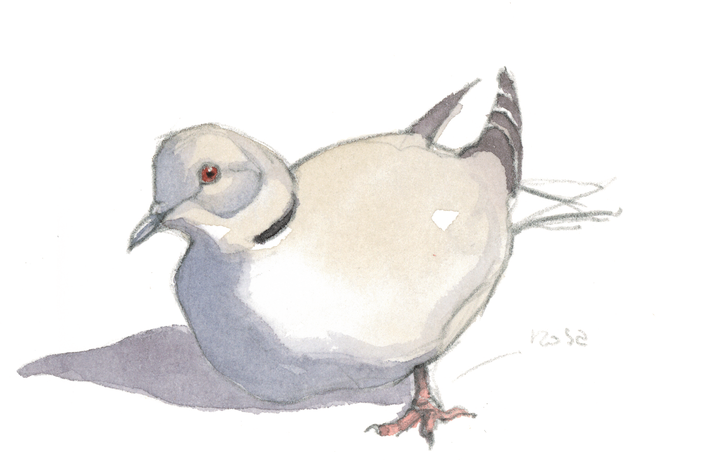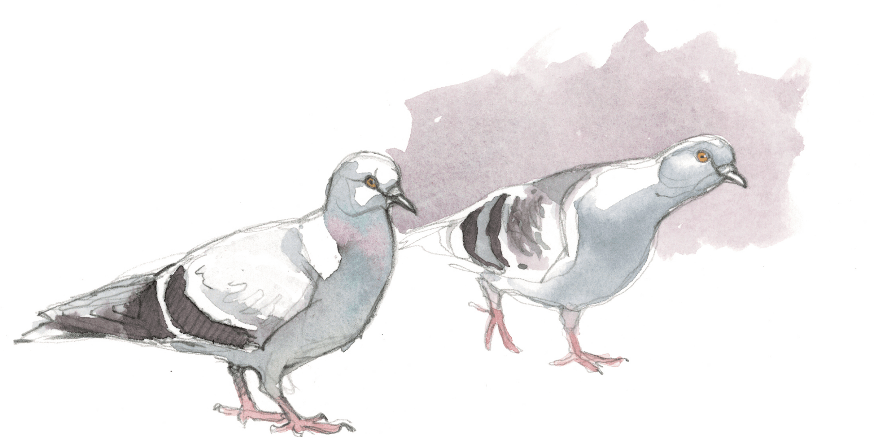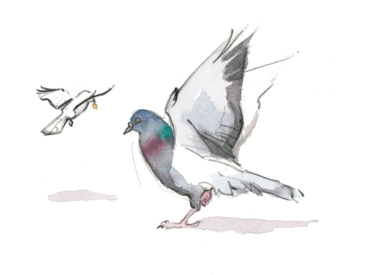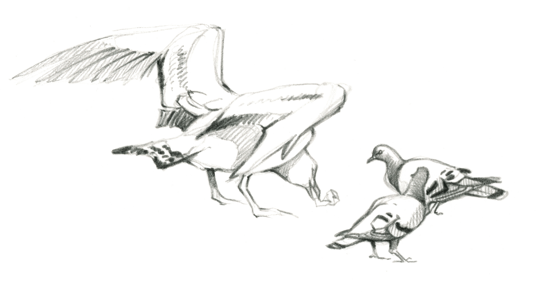 L'agitation et les piaulements des moineaux sur la terrasse du bistrot attirent l'attention des maîtres de l'air citadin. Quelques pigeons bisets, visiteurs fidèles des lieux fréquentés par l'homme, rejoignent le petit café d'un vol en piqué depuis le haut du clocher. Ils avancent sous les chaises en évinçant les moineaux grâce à leur taille imposante. Sans jamais s'arrêter, ils picorent les miettes en hochant le cou comme des jouets rechargeables.