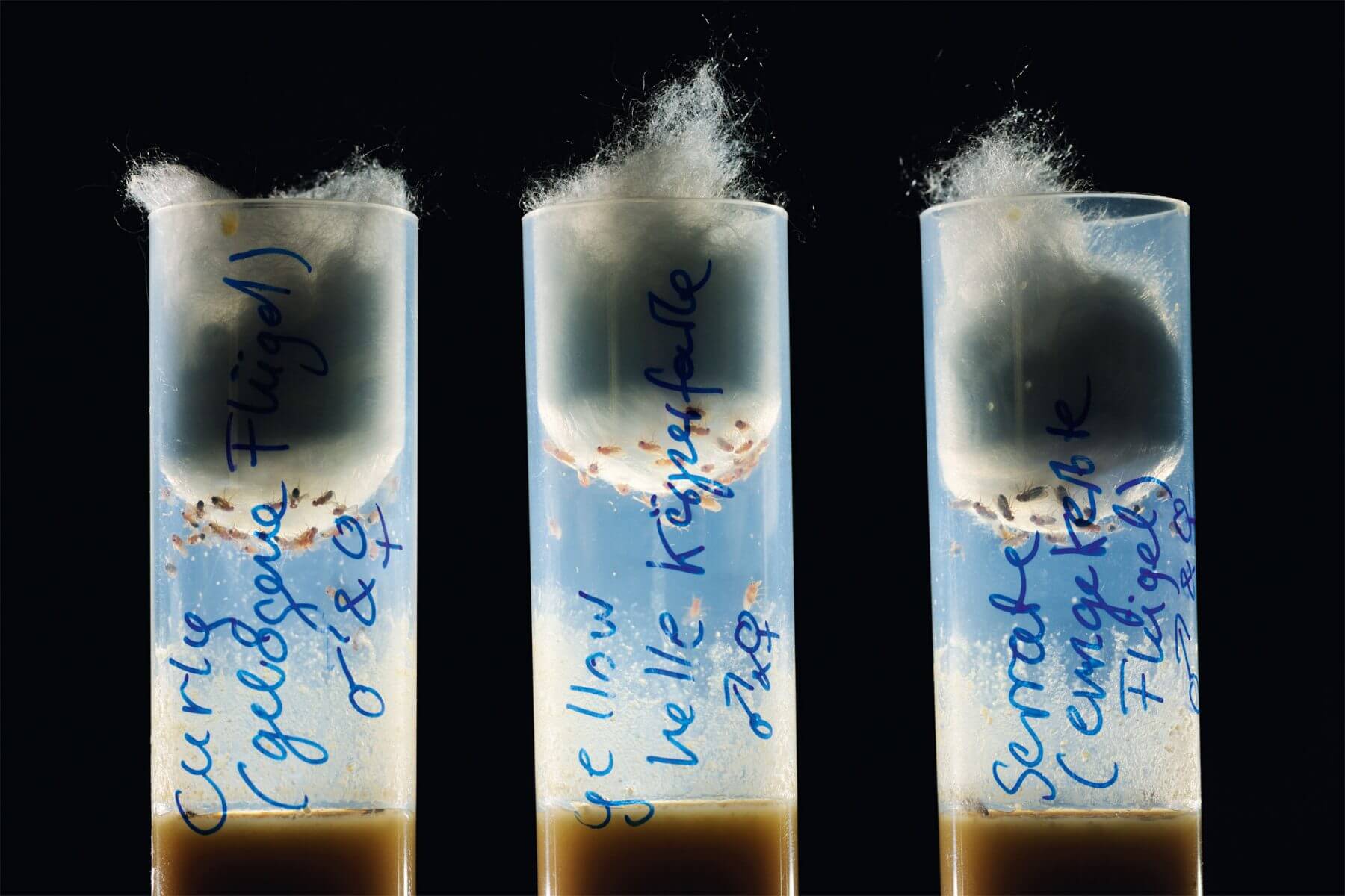 Vous voyez toutes ces grandes armoires le long du couloir ? Elles renferment des millions de drosophiles originaires du monde entier qui vivent et meurent dans des milliers de tubes en verre. La mouche du vinaigre comme on l'appelle est extraordinairement facile à élever. Il suffit de déposer un mélange nutritif au fond d'une éprouvette, d'y mettre quelques moucherons et de stocker le tout à 25°C. Une femelle pond 100 œufs par jour. A ce rythme-là, vous obtenez déjà une nombreuse nouvelle génération dix jours plus tard. Cette fréquence élevée permet toutes sortes d'expériences impensables chez la plupart des autres organismes vivants.