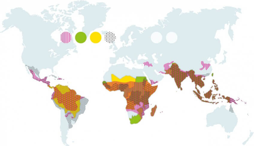 Fièvre jaune: 200’000 nouveaux cas par an, 30’000 morts. Voilà le bilan du virus amaril, endémique en Afrique et en Amérique du Sud et transmis par certains Aedes. Le mal est incurable. Il a progressé depuis 20 ans en raison de la baisse de l’immunité des populations, de la déforestation, de l’urbanisation, des mouvements de population et des changements climatiques.
