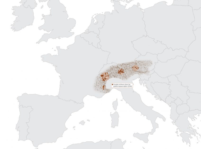 C’est le nombre moyen de jeunes à l’envol par couple de gypaètes nicheurs dans les deux noyaux alpins principaux : le secteur au sud et à l’est du lac Léman, comprenant Haute-Savoie et Valais, et d’autre part les Grisons à l’est de la Suisse. Ainsi, quand tout va bien, un couple de gypaètes se reproduit un an sur deux en moyenne. Sans raison connue, ce chiffre chute à 0,2 dans les deux populations situées aux extrémités de l’arc alpin (frontière franco-italienne méridionale et Autriche centrale).