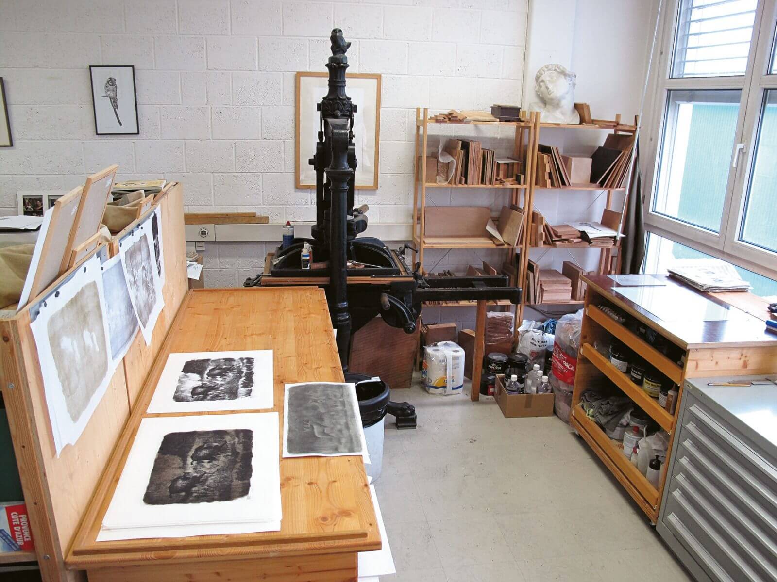 L'impression se fait sur du papier japon, grâce à une presse à bras en fonte qui date de 1846. Je fais d'abord des essais et des repérages pour tester les superpositions. Puis vient le moment de l'édition : 50 exemplaires pour ces freux. Le processus total de gravure aura pris environ trois semaines. Seulement 10 à 15 œuvres naissent de ma presse chaque année. Alors pourquoi utiliser une technique qui prend autant de temps ? J'aime l'idée que nous sommes limités, que nous ne pourrons jamais tout voir, jamais tout dessiner non plus. Cette relation au temps est contraignante ! Mais elle engendre une précieuse liberté, celle de choisir. »