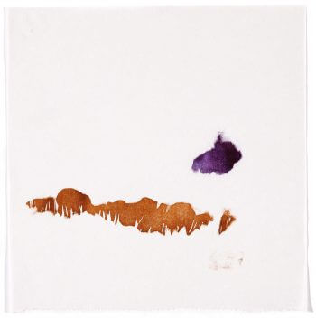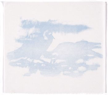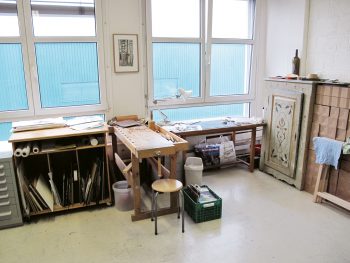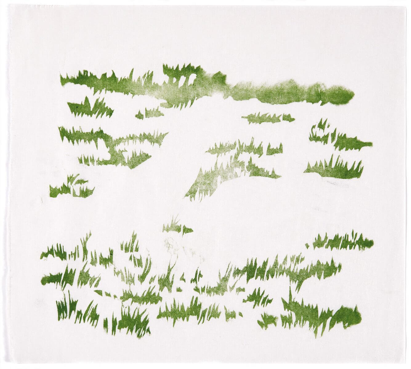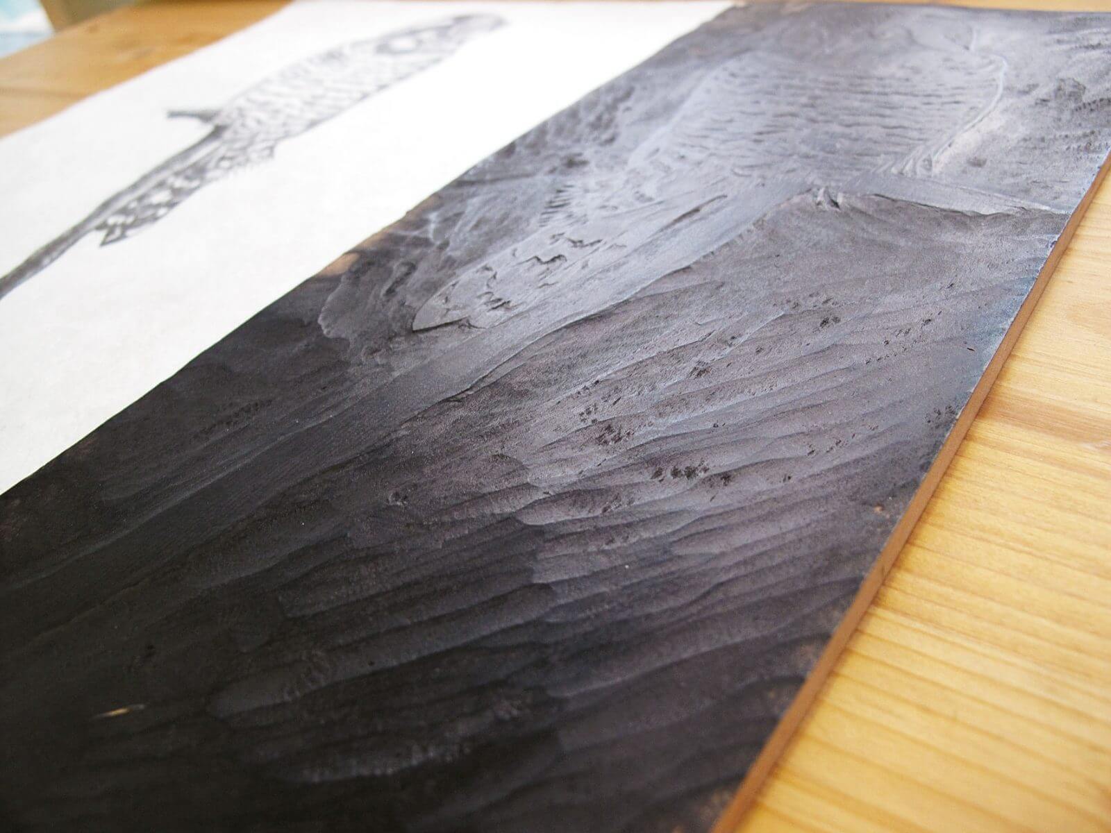 « L'été suivant, le travail en atelier est lancé. Sur mon croquis de terrain, je commence par décalquer les lignes de force, transposées ensuite sur le bois grâce à un papier carbone. Puis la gravure débute. C'est un travail d'épargne, on sculpte un relief, c'est-à-dire que tout ce qui est creusé ne s'imprimera pas. La couleur est ensuite déposée au rouleau. Chaque teinte nécessite de graver une lame de bois. Pour l'image des corbeaux, j'ai utilisé six bois pour sept couleurs. Le mauve et le marron ont pu être déposés sur une même pièce.