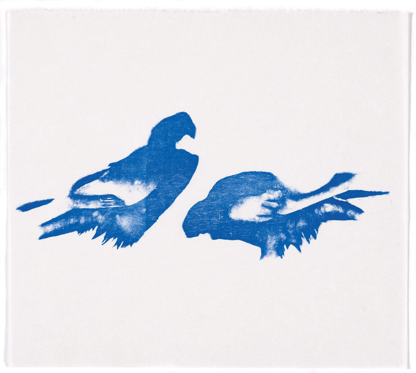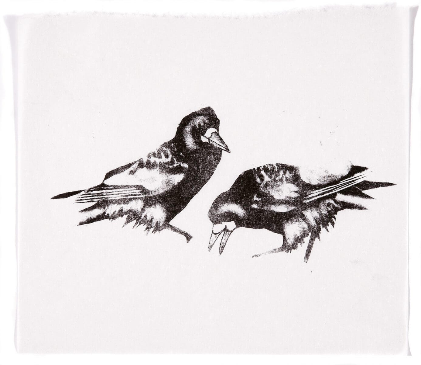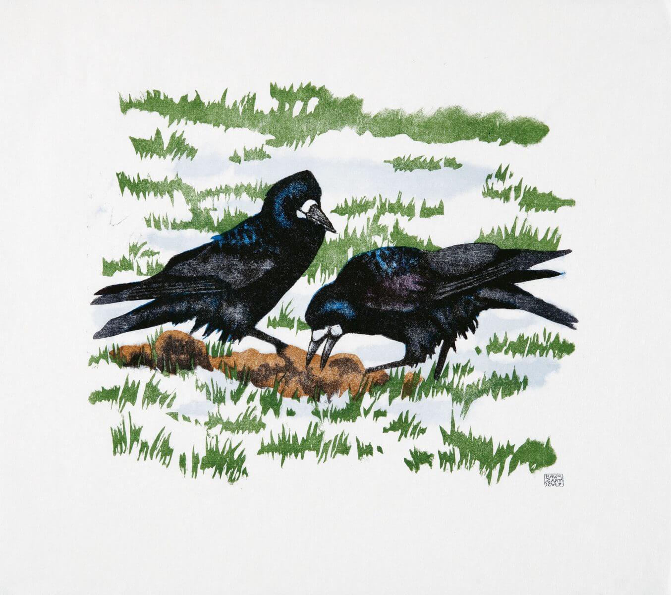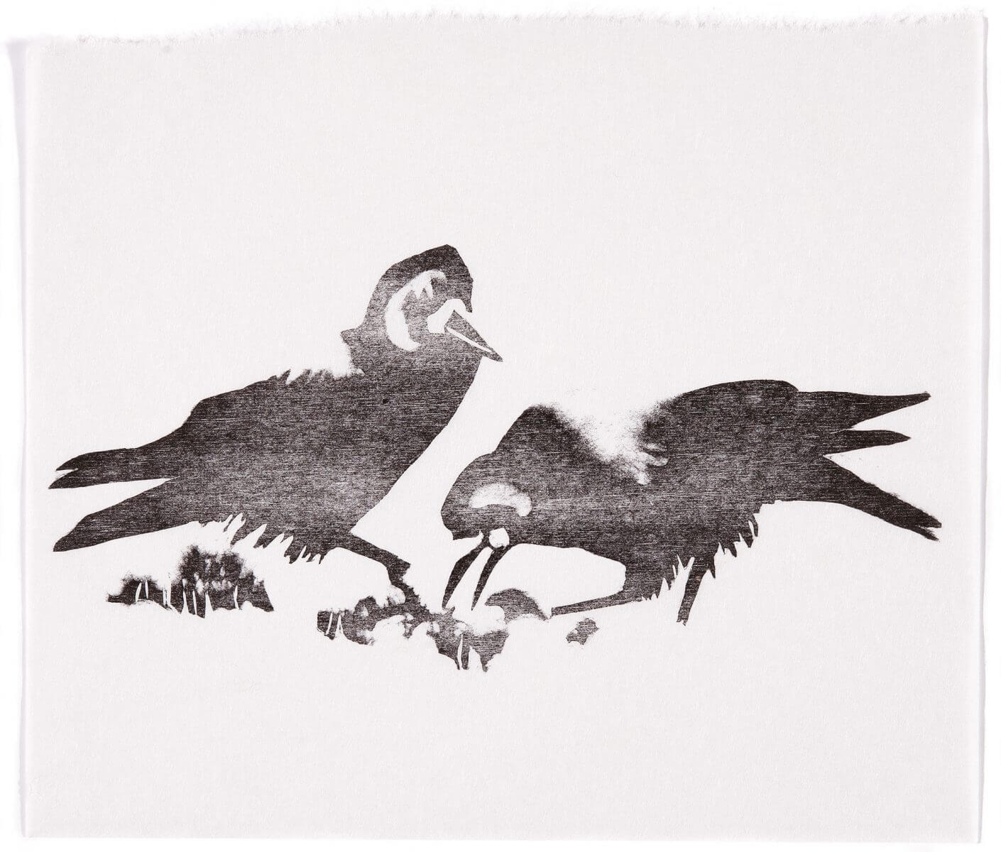 « D'abord, ce couple m'a rappelé la mythologie scandinave. Le dieu Odin possède deux corbeaux qui tournent autour du monde et lui rapportent ce qu'ils y voient. Je les ai choisis parce qu'ils font partie de ces oiseaux communs que l'on représente peu. Les corvidés ne sont pas secrets, on les voit facilement. Et puis, ils paraissent tout noirs. Pourtant, leur plumage est loin d'être uni. A y regarder de plus près, on distingue des reflets bleus, presque mauves. C'est ce qui m'a touché, ce que j'ai souhaité explorer. Une tâche fascinante pour un graveur, de chercher la couleur dans le noir ! Lorsque l'œuvre finale sort de la presse, toute la tension et l'attention du processus de création se relâchent. Je ressens alors un soulagement, mais aussi, souvent, une certaine déception. Ce sont les petits défauts qui me sautent aux yeux. Aurais-je pu faire encore mieux ? Je dois alors me détacher de cette gravure qui m'a tenu en haleine pendant si longtemps. Quand je la retrouve plus tard, j'apprécie à ce moment d'avoir mené à bien le défi que je m'étais lancé. »