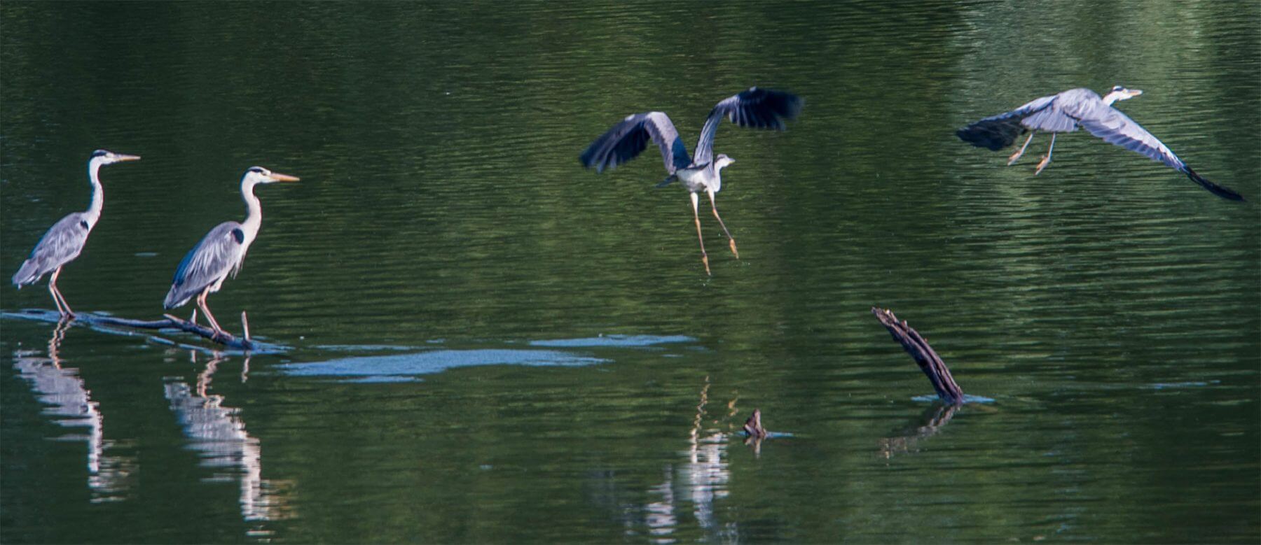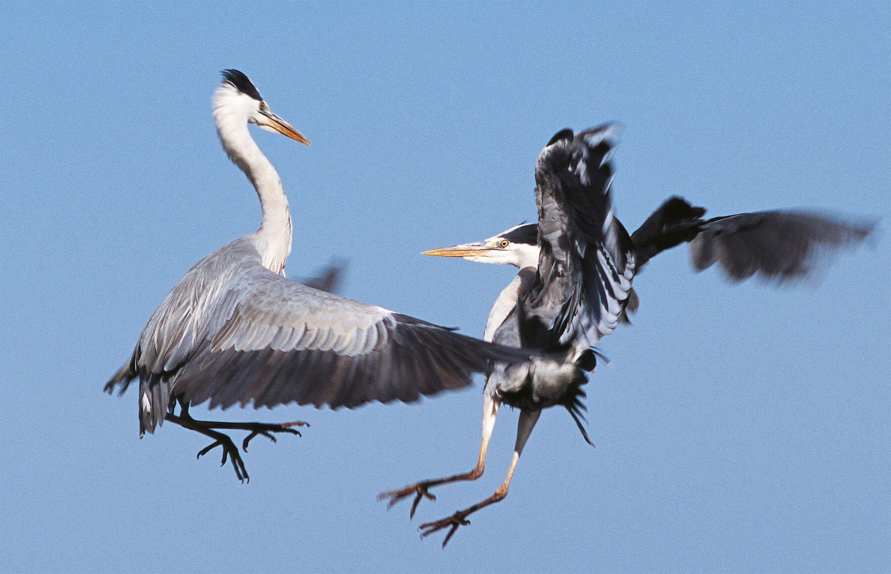 A côté, les voisins jasent. Vieux jaloux ou jeune rival, l’un d’eux lui vole dans les plumes. Les mâchoires claquent, les pattes fouettent, mais notre héron se montre supérieur : il chasse l’intrus d’un coup de bec bien ajusté.