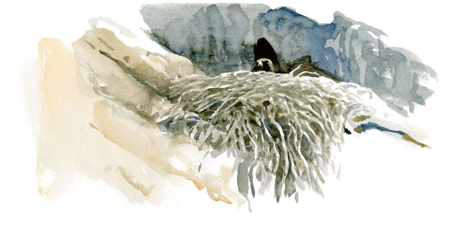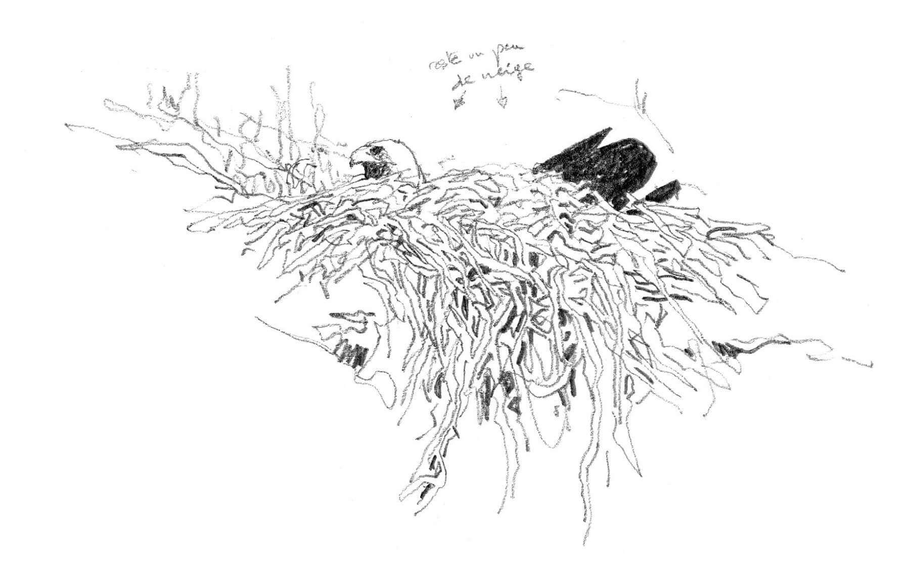 Durant les deux mois et demi que va durer la couvaison, la femelle ne quittera le nid que pour de courtes expéditions. Son alimentation est toujours garantie par son partenaire. Il ne dépose plus les proies dans l'aire, mais sur un reposoir visible depuis le nid. Cette stratégie évite probablement à la couveuse, euphorique à la vue d'une appétissante marmotte, de piétiner ses œufs. Pendant que lui prend le relais sur le site de ponte, elle peut s'élancer et frôler les pins rabougris de la crête. Deux fois par jour, la future mère peut enfin se dégourdir les ailes et savourer trois quarts d'heure de liberté sauvage.