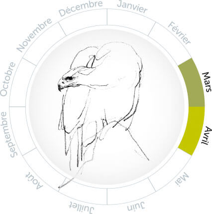 Les jours précédant la ponte, la femelle reste perchée pendant des heures en haut d'un éperon rocheux non loin du nid. Elle paraît contempler son royaume enneigé. Dans ses entrailles, la maturation des œufs demande beaucoup d'énergie. A cette période et à cette altitude, il gèle encore de nuit comme de jour.