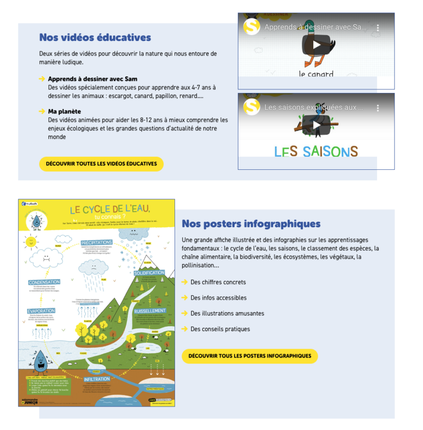 - Nos vidéos éducatives : Deux séries de vidéos animées Apprends à dessiner avec Sam (4-7 ans) et Ma planète (8-12 ans) pour découvrir la nature qui nous entoure de manière ludique et mieux comprendre les enjeux écologiques et les grandes questions d’actualité de notre monde.