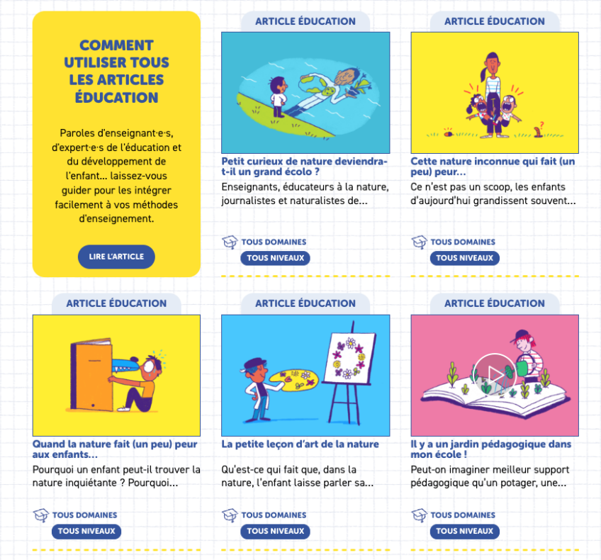 - Nos articles éducation : Des articles rédigés par une journaliste spécialisée éducation et illustrés avec humour pour lire des paroles d'experts et des retours d'expériences pour aider l’enseignant·e dans sa réflexion éducative et dans sa pratique pédagogique.