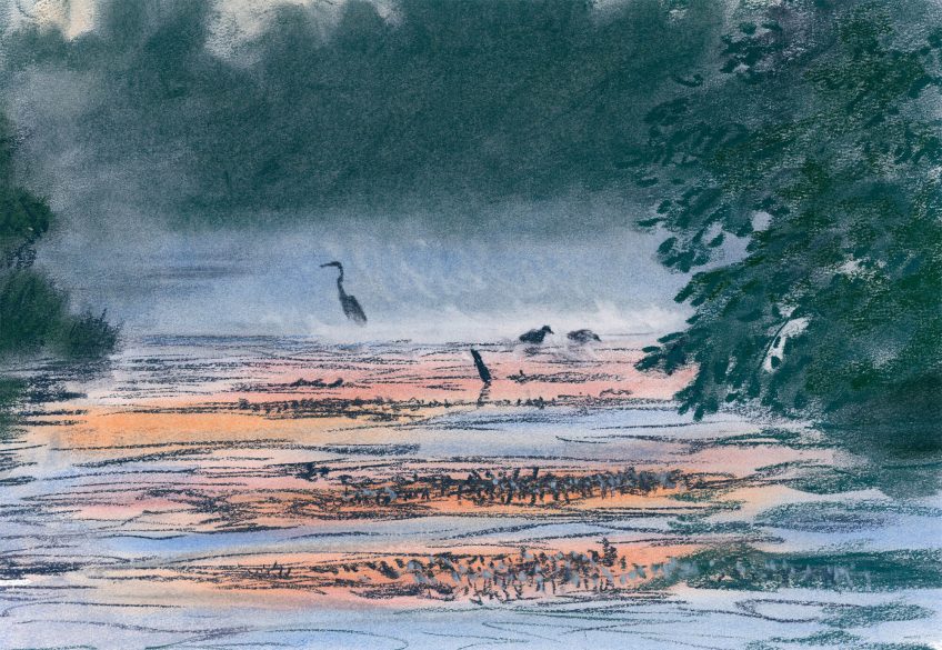 Une fois passé l’heure des moustiques, c’est la fraîcheur qui gagne. Des sauts de poissons maintiennent mon attention. Parfois, un héron vient pêcher, l’effraie chuinte et passe. Les cris ténus des passereaux en migration se répondent par moments, ceux flûtés d’un vol de guignettes ou d’aboyeurs résonnent longuement à l’horizon.
