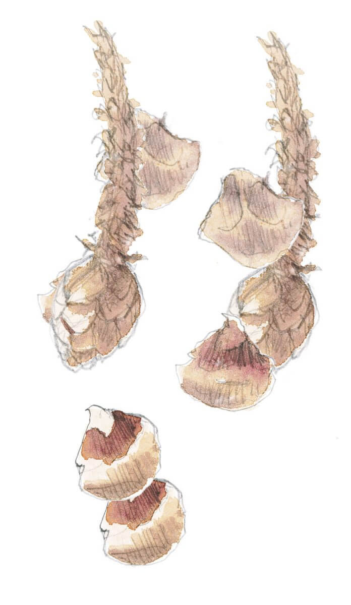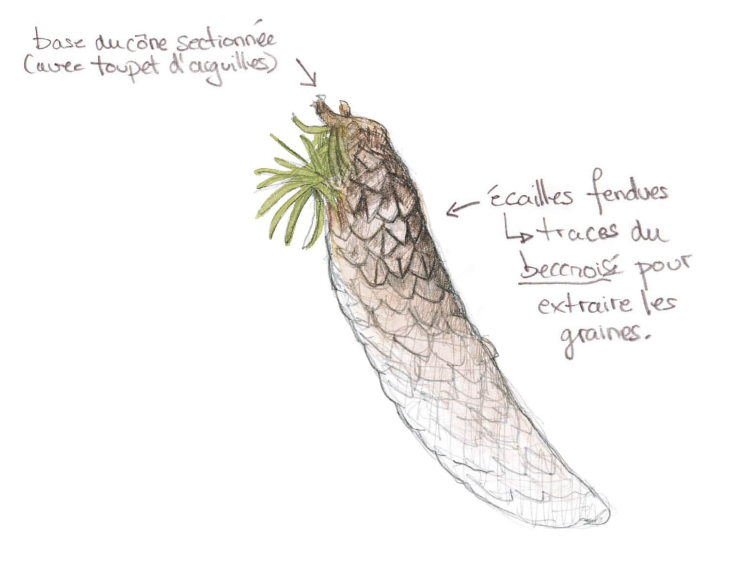 Les fentes laissées par le bec du bec-croisé dans les écailles de pignes sont un signe sûr de la présence de l'oiseau.