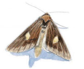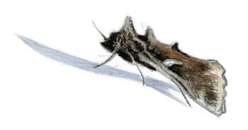 Approchons-nous ! La loupe révèle deux pans d’une très belle étoffe aux dégradés enrichis de légers points clairs. Yeux noirs, palpes tendus comme une corne, le papillon de nuit tient la pose encore un instant, avant de s’évanouir dans la nature.