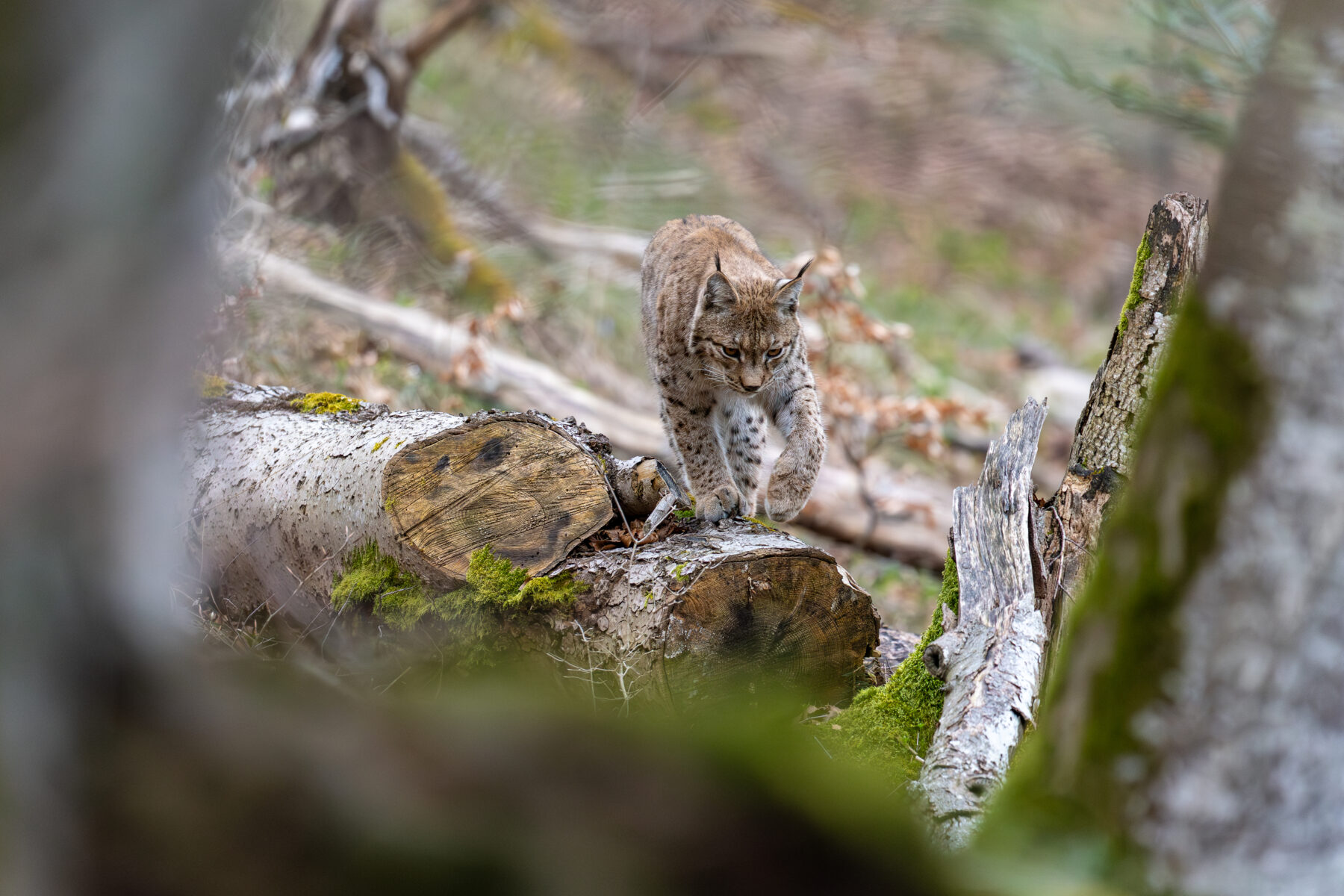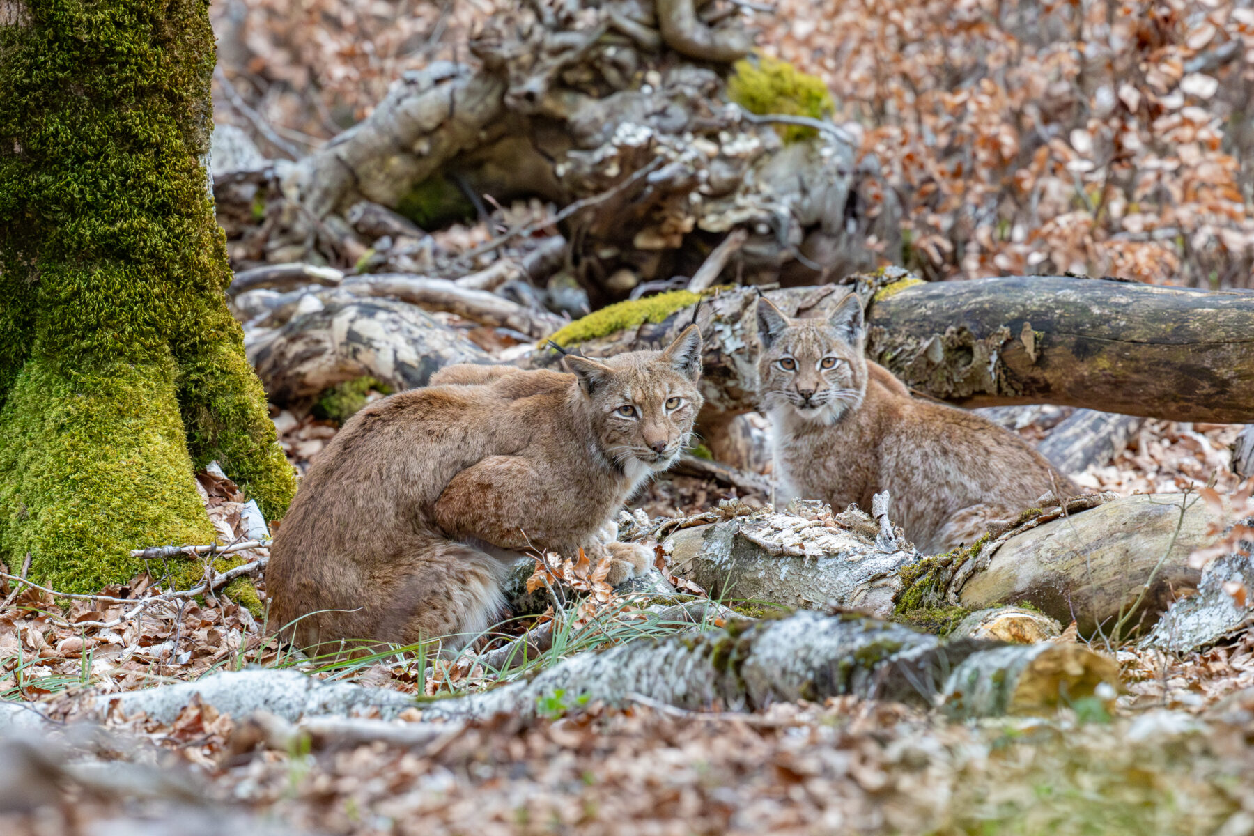 “Au détour du chemin, je tombe nez à nez avec un chamois. D’abord curieux, l’animal quitte ensuite le chemin et descend bruyamment dans la pente. C’est alors que j’aperçois une forme accroupie 60-70 m devant moi, au bord du sentier. Coup de jumelles : un lynx ! Il bâille, enchaîne un brin de toilette, puis se lève et abandonne la piste. Je me mets à l’affût dans les feuilles mortes. Dix minutes après, le lynx se matérialise dans le sous-bois et marche devant moi… talonné par un deuxième individu ! Un troisième lynx avec les sens totalement en éveil les suit d’un pas mesuré. Je réalise qu’il s’agit d’une femelle avec ses deux petits de l’année précédente”.