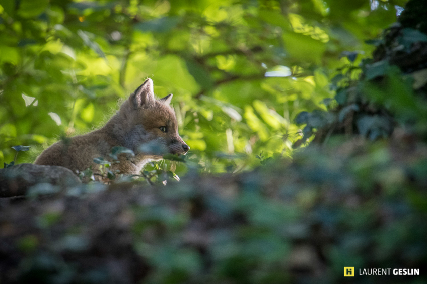 Au moindre bruit, la renarde tourne la tête. Entend-elle les clics de l’appareil, malgré la moufle antibruit ? Dans le doute, Laurent Geslin doit bien maîtriser le rythme des prises de vue en essayant de ne pas l’inquiéter outre mesure. Heureusement il y a d’autres sons dans la forêt et les déclanchements peuvent s’y effacer.
