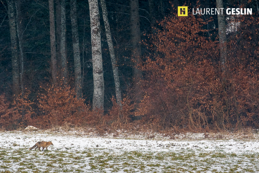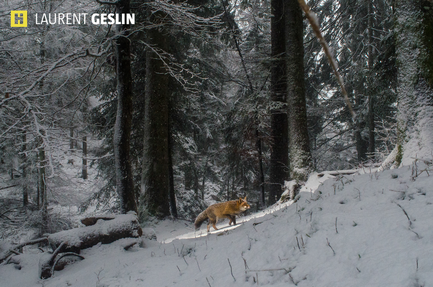 Les flocons qui ont saupoudré les pâturages et les forêts ces derniers jours facilitent les repérages et la recherche des traces des goupils. Au bout de plusieurs sorties sans voir un chat ou un chevreuil, Laurent Geslin a brisé la glace en photographiant un beau rouquin dans un paysage enneigé aux teintes automnales. Où se rend-il, ce renard ? Où habite-il ? Laurent et François parviendront-ils à suivre sa trace sans le déranger ? La grande quête vient de commencer.