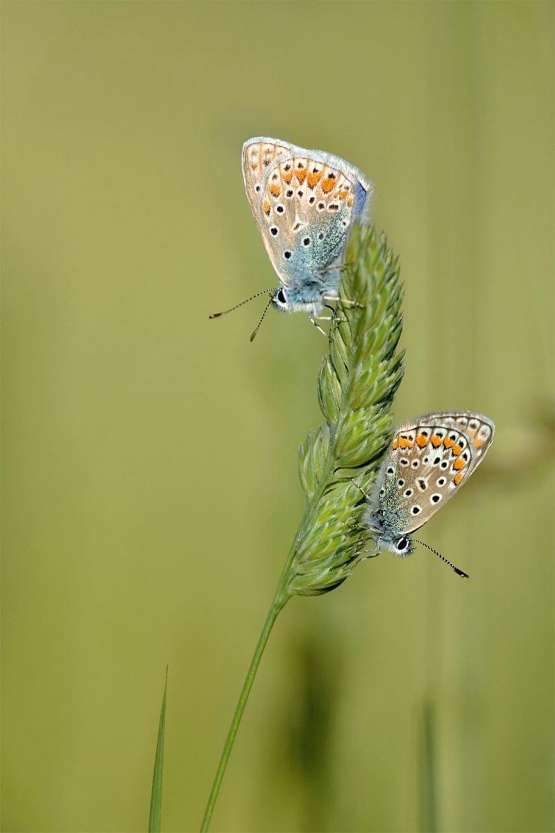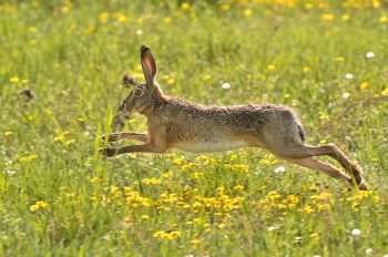 Allongé dans les herbes, je suis occupé à photographier des papillons lorsqu’un mouvement rapide en lisière d’une haie d’aubépines me fait lever la tête. C’est un lièvre ! Je crois qu’il ne m’a pas repéré… Alors que je prépare mon téléobjectif, il fonce droit sur moi puis change brusquement de direction. Il est maintenant tout proche. Juste le temps de faire la mise au point et le voilà figé dans sa course.