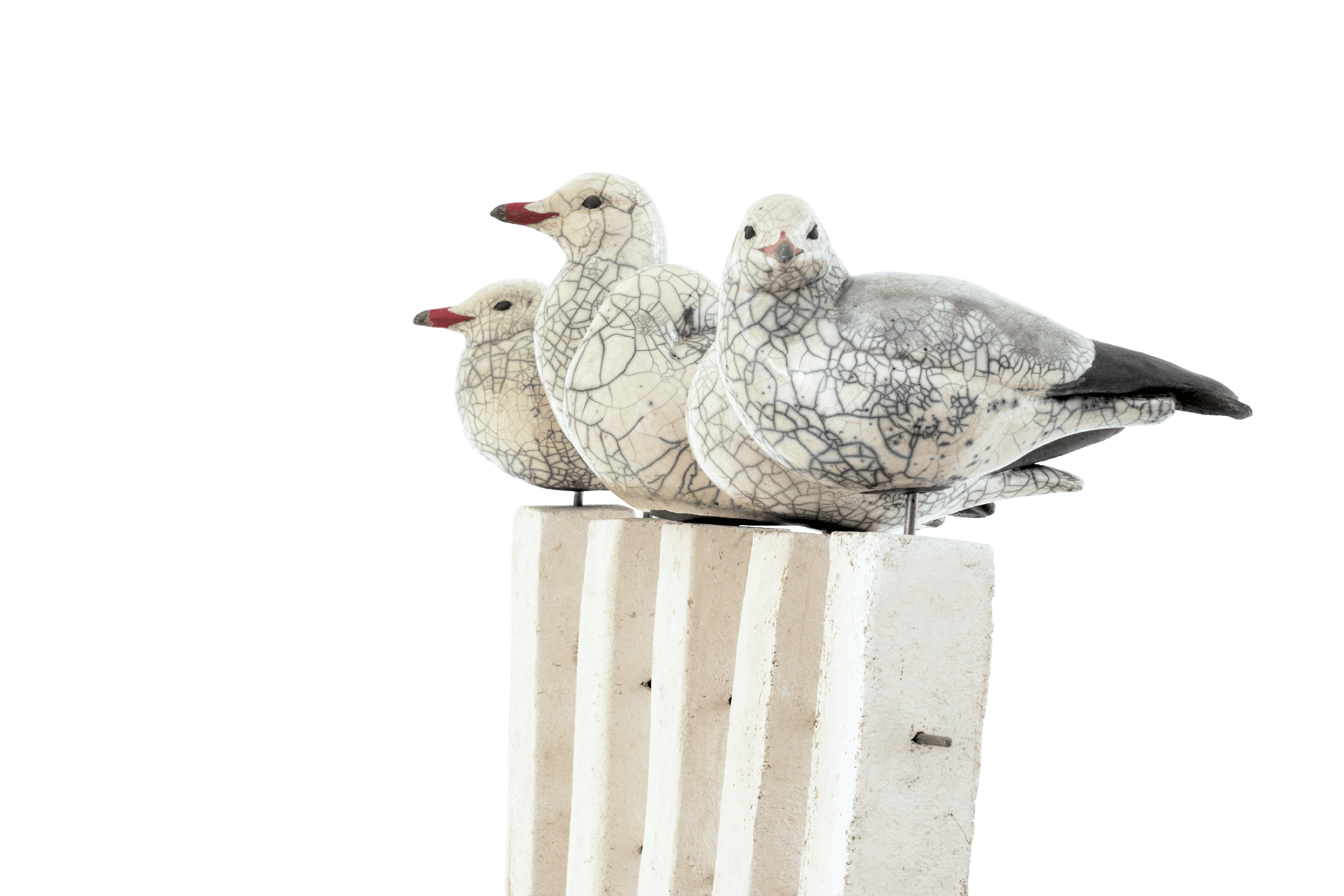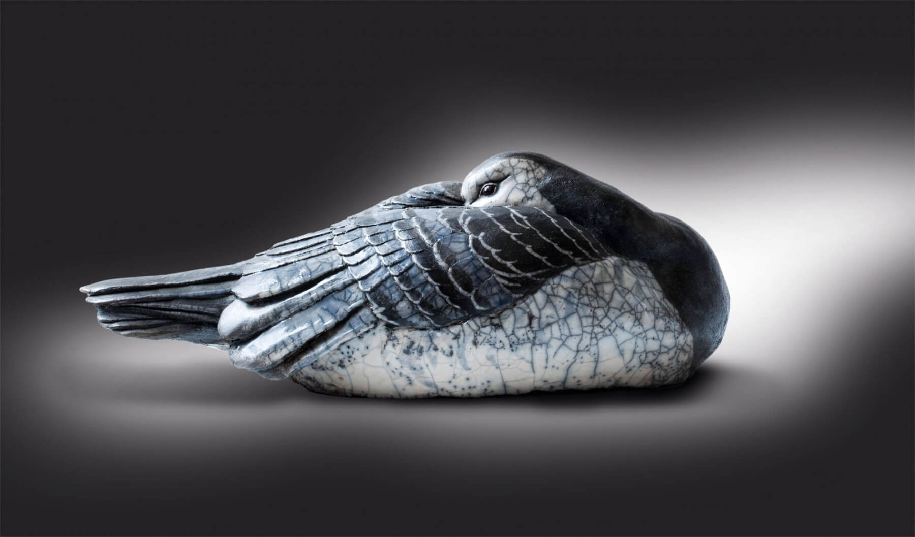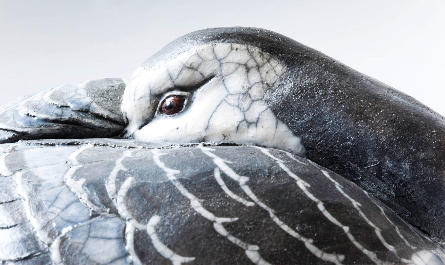« J'avais observé cette bernache nonnette sur une plage, en décembre, lors d'une résidence d'artistes en Vendée. J'ai aimé sa position, sa forme ronde, son œil attentif au milieu des plumes grises. Dans un premier temps, j'ai cuit ma pièce de terre pour obtenir un oiseau uniformément blanc. Puis j'ai recouvert tout ce que je voulais garder clair avec un émail transparent. Après une deuxième fournée, j'ai plongé la petite oie incandescente dans une brouette de sciure. La fumée a coloré les gris et le choc thermique a amené les jolies craquelures caractéristiques de cette technique appelée raku. »