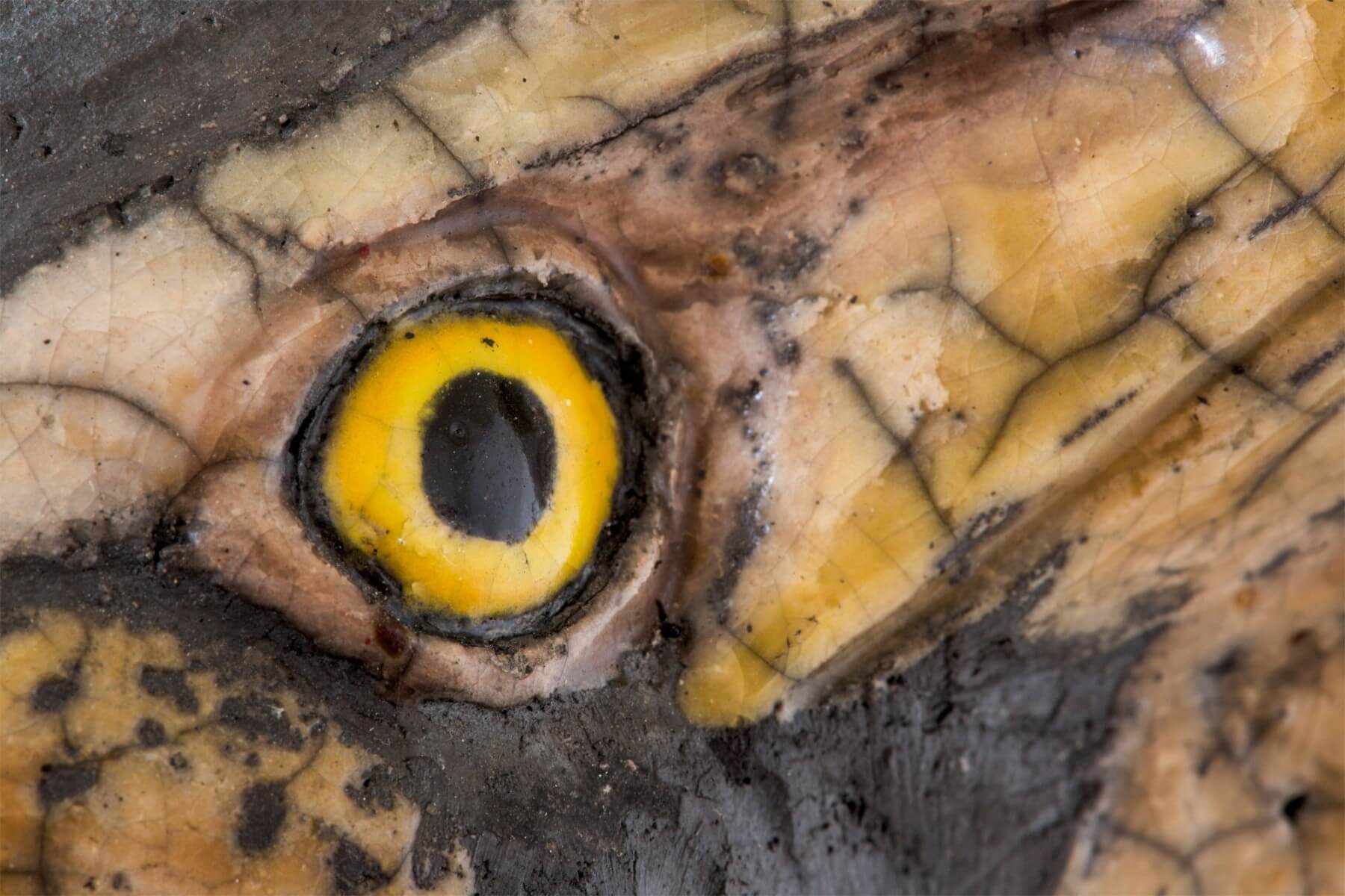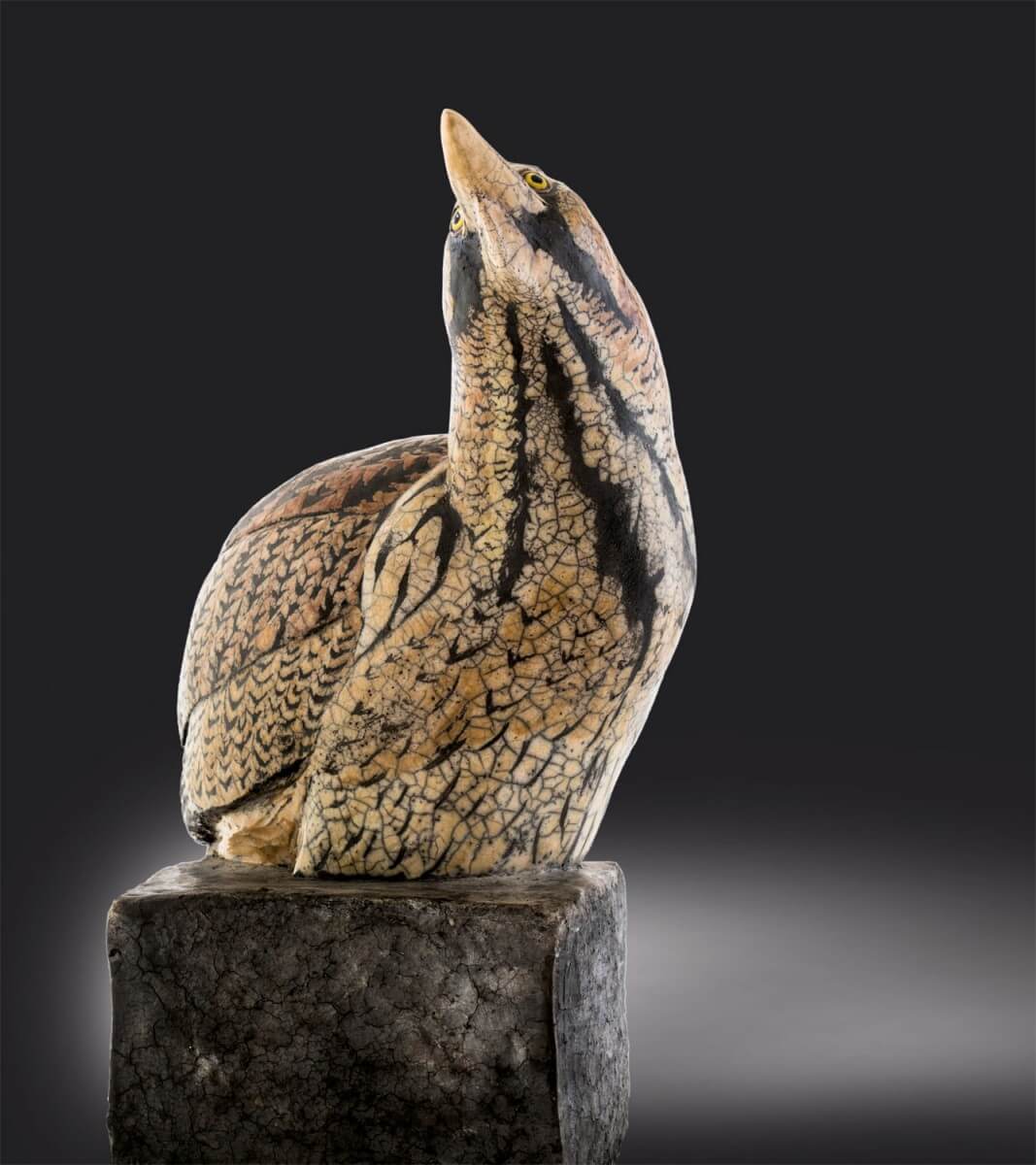 « Les dégradés de brun de ce grand butor ont été difficiles à obtenir. Car, avant cuisson, mes émaux n'ont pas encore leur couleur définitive. C'est une recherche, et chaque fois il y a des surprises. J'aime m'amuser avec la terre et les couleurs pour trouver l'animal. En général, le plus périlleux, ce sont les yeux. Si leur expression ne fonctionne pas, la pièce est ratée. Pour mon butor, j'ai commencé par esquisser un rond noir autour du cercle orbital. Puis, j'ai passé plusieurs émaux devant produire à la cuisson des jaunes subtilement différents. Et enfin, une petite goutte noire pour la pupille, histoire de traduire l'intensité exceptionnelle du regard de ce héron. »