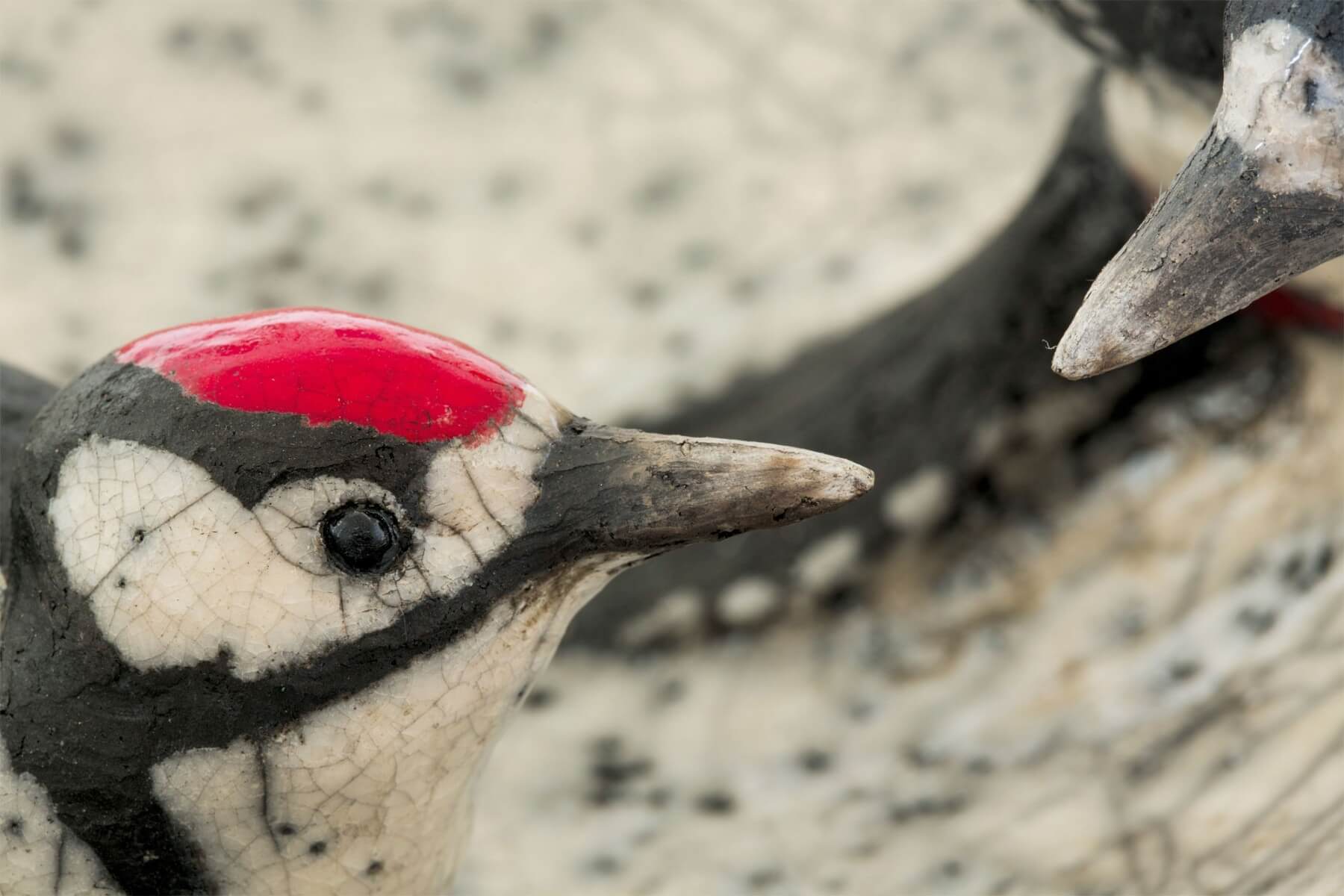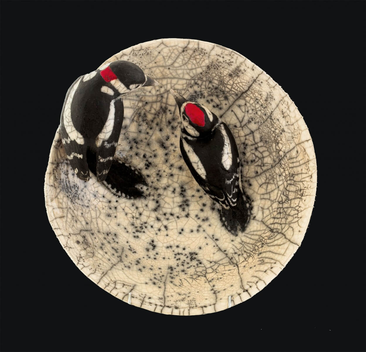« Cet été, deux pics épeiches sont venus me rendre visite sur le cerisier du jardin. Peut-être étaient-ils attirés par les fruits murs ou par l'écorce couverte de lichens du vieux fruitier. Je les ai modelés sur une grande coupe décorative. Evidemment, j'essaie d'éviter le plus possible des émaux au plomb pour ne pas trop m'intoxiquer. Mais pour obtenir un rouge de cette force, je n'ai pas le choix. L'émail utilisé a une drôle de consistance, il est très difficile à poser, mais produit une couleur incroyable. »