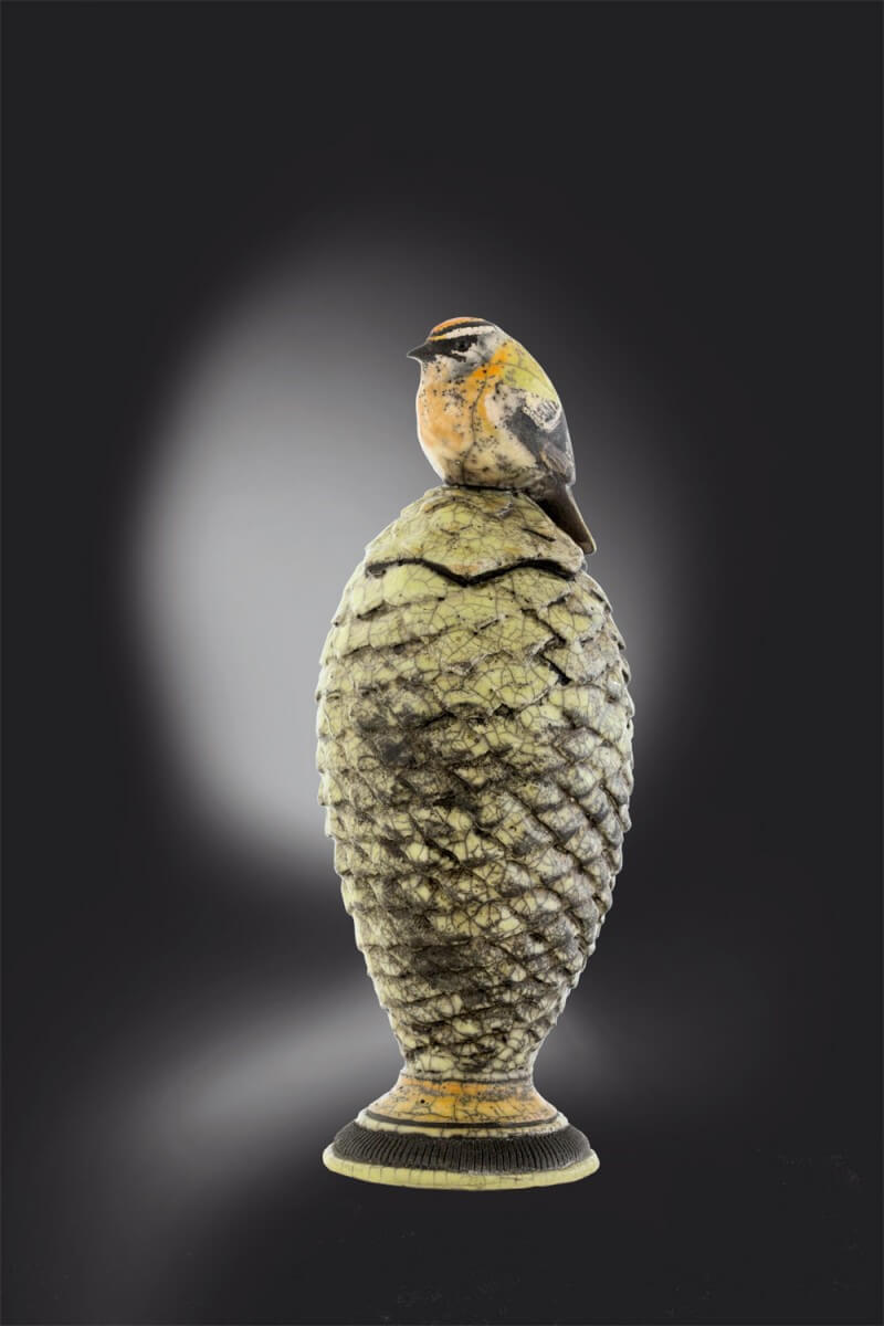 « J'aime bien ce roitelet triple-bandeau. J'ai choisi de le modeler perché sur une pomme de pin en forme de vase. Il me rappelle cette jolie histoire dans laquelle les oiseaux se réunissent pour se désigner un roi. Celui qui volera le plus haut gagnera ce titre. L'aigle surpasse tous les autres en planant tout en haut du ciel. Mais il n'a pas remarqué qu'un passager clandestin se tient perché sur son dos, et que celui-ci frôle le soleil de si près qu'une tache jaune se marque sur son front. L'aigle est incontestablement le roi... mais le petit imposteur gagne son joli nom de roitelet. Je l'ai fait minuscule, grandeur nature.»