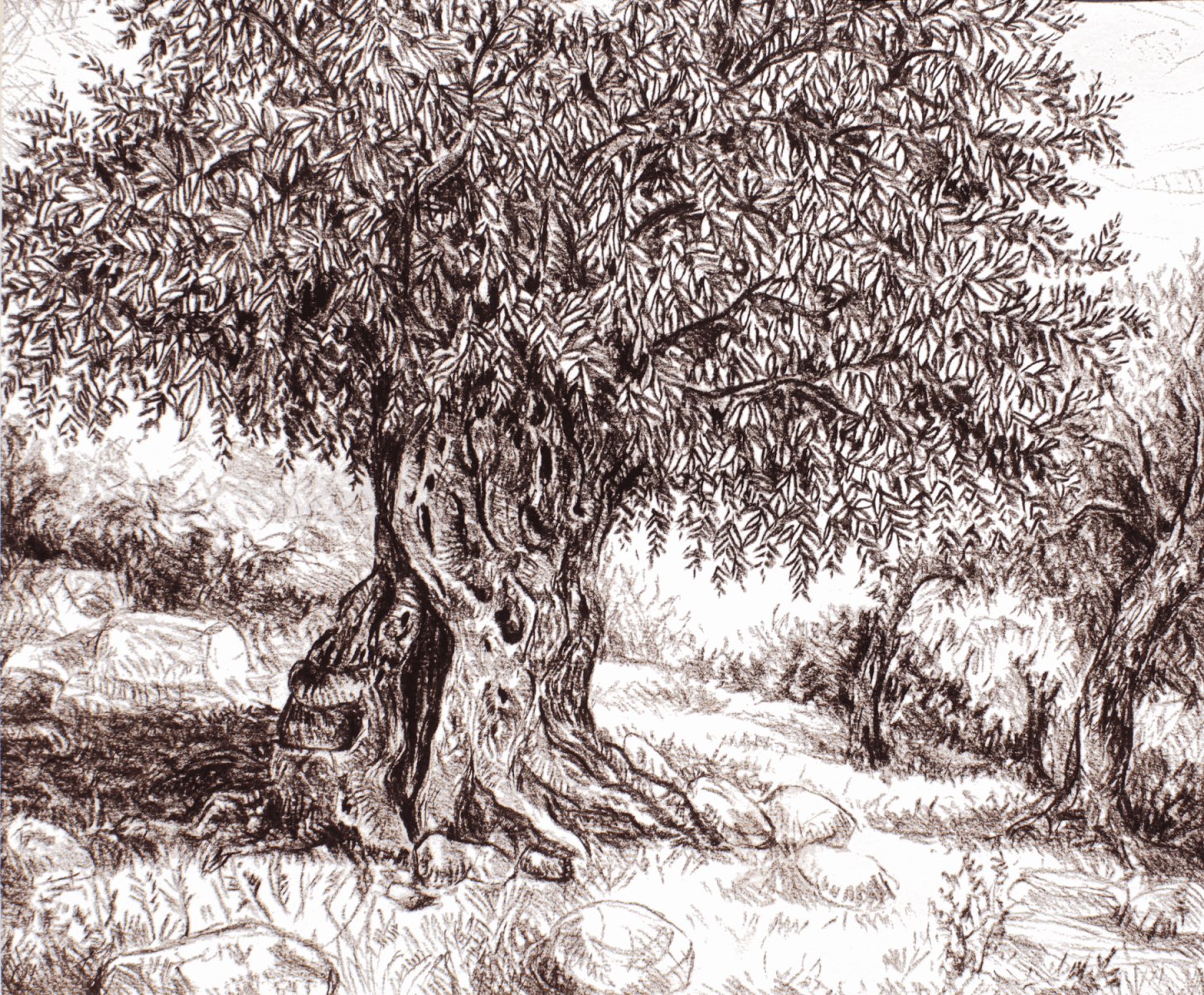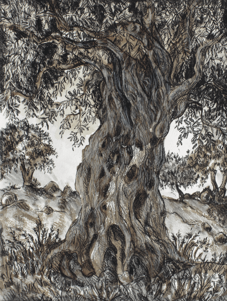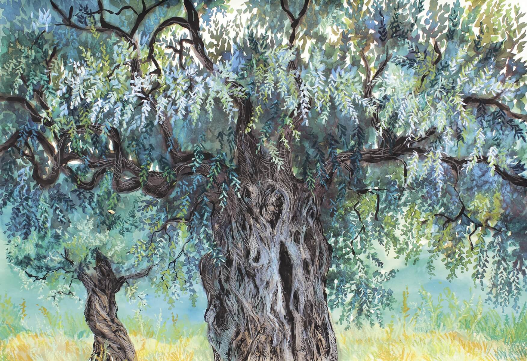 Pascaline Bossu balade ses pinceaux parmi les troncs ridés ancestraux. Encre de Chine, sanguine, pastels secs ou gras… flattent l’ olivier, arbre mythique de Méditerranée.