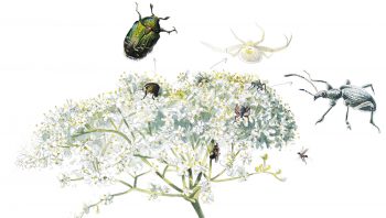 Son cousin le charançon est plus prudent. Il évite les ombelles et balade son rostre entre les feuilles. Le myrtil ne fera qu’une rapide incursion sur un corymbe pour y tremper sa trompe. Le nectar ne semble pas au goût du papillon déjà envolé. Et puis il y a ces minuscules moucherons qui volent sur place les pattes pendantes. Hésitants, ils approchent des fleurs par à-coups. Ne vont-ils jamais se poser ?