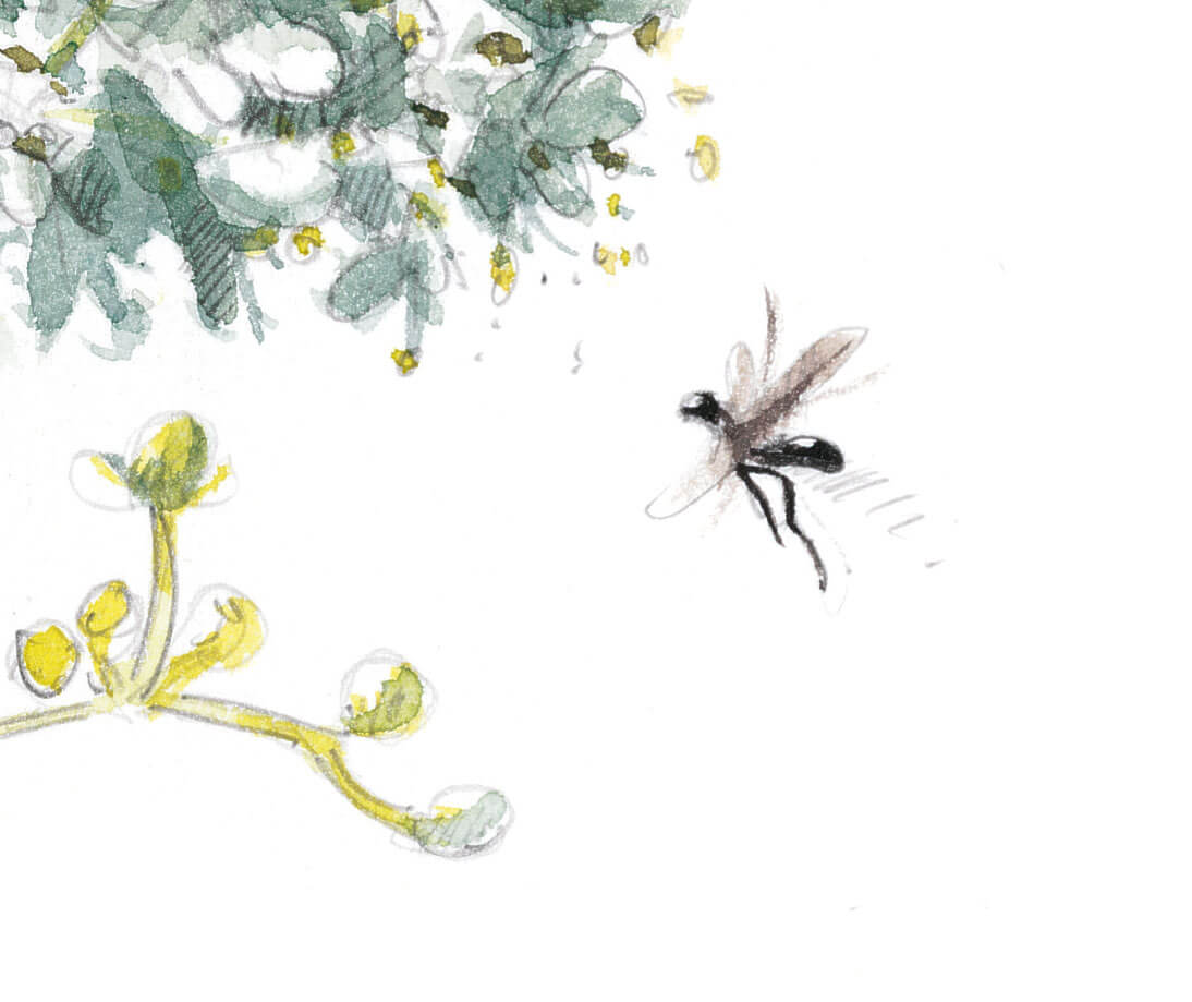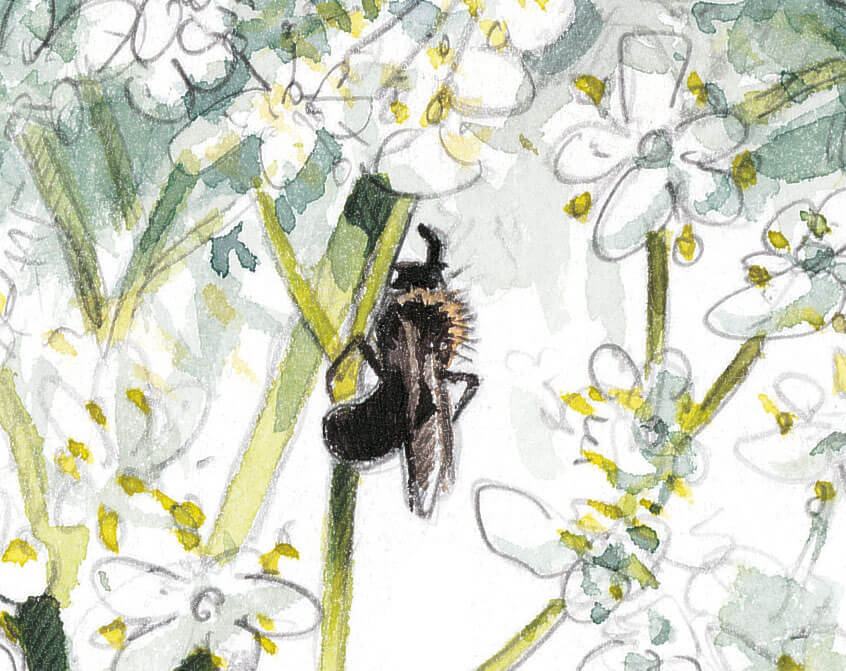 Il est presque midi. Dopés à l’énergie solaire, les insectes agitent leurs ailes et se dirigent tout droit sur les pompons blancs.