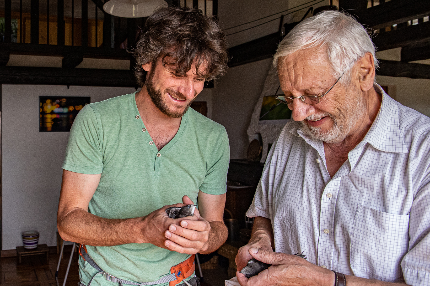 21 juillet, 9 h 59. La sonnette retentit en me faisant sursauter. Mon complice Marcel est à l’heure, précis comme un martinet au printemps. Je me réjouis : aujourd’hui, c’est le grand jour du baguage des jeunes Apus apus, et notamment de Rafale et Eclair, la nichée 2021 du couple Bise et Azur suivi par webcam 24/7. Le spécialiste prépare ses outils: des pinces, un vieux classeur aux coins cornés, une balance et de petits sacs en tissus blancs qui sentent l’eau de Javel. J’enfile le baudrier de mon ami Martower et m’aventure sur le bord de la fenêtre en tirant sur la corde. Une petite avalanche de fientes sèches dévale sur les tuiles à l’ouverture du portillon du nichoir. A l’aveugle, je saisis délicatement un jeune, puis l’autre, et les passe à Marcel.