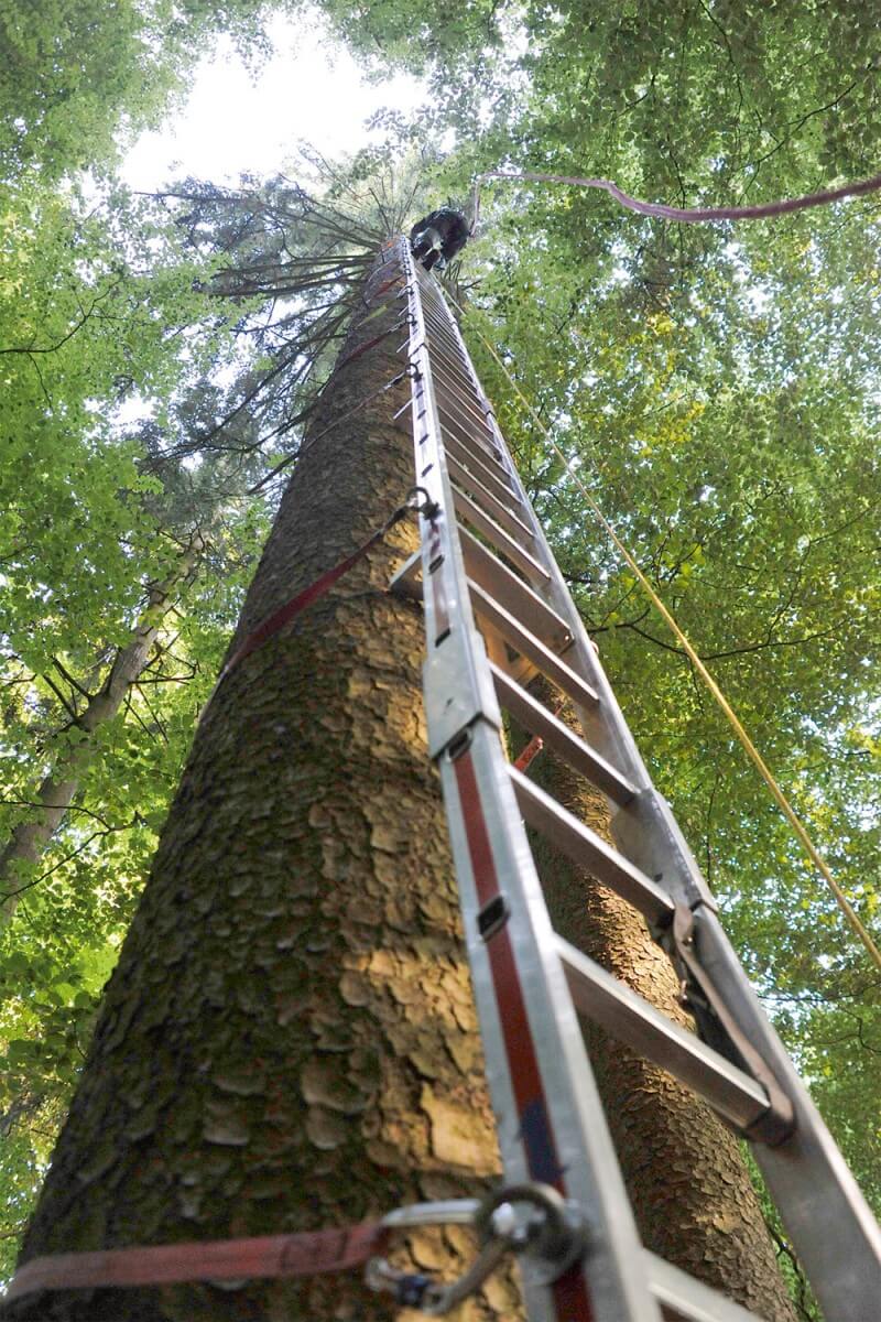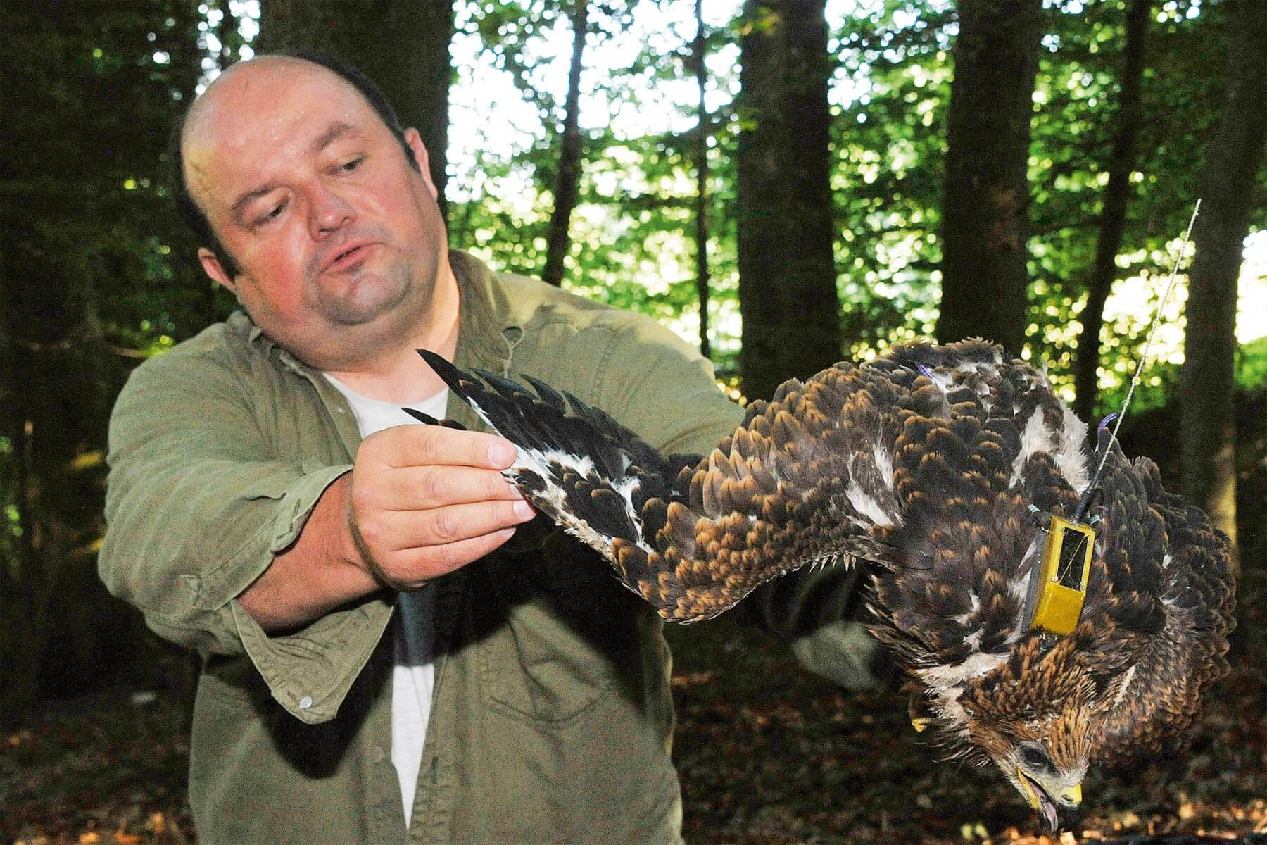 A Mariahilf, tout près de Fribourg, Mikaël Cantin est grimpé sur l’épicéa qui portait le nid à une hauteur de 32 mètres. Les deux jeunes milans noirs ont été très temporairement descendus à terre où leur manipulation est plus facile. L’heureux élu est âgé d’environ 34 jours. Il volera dans une dizaine de jours.