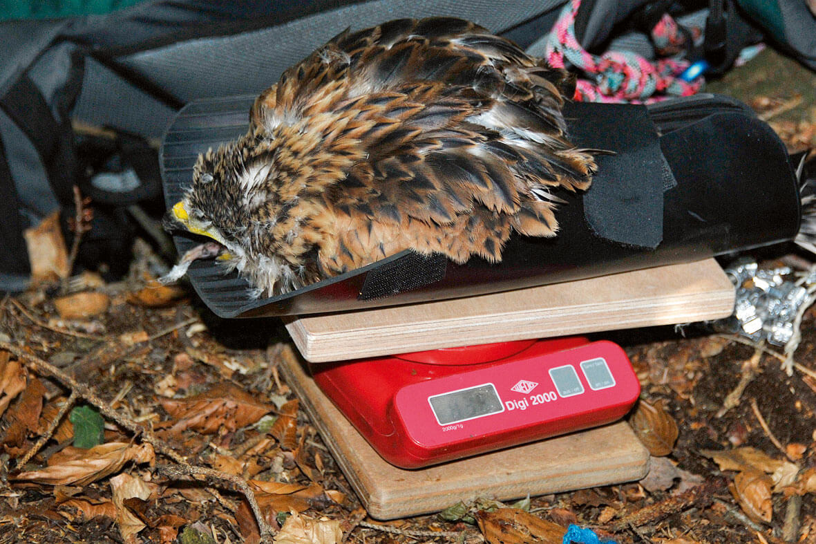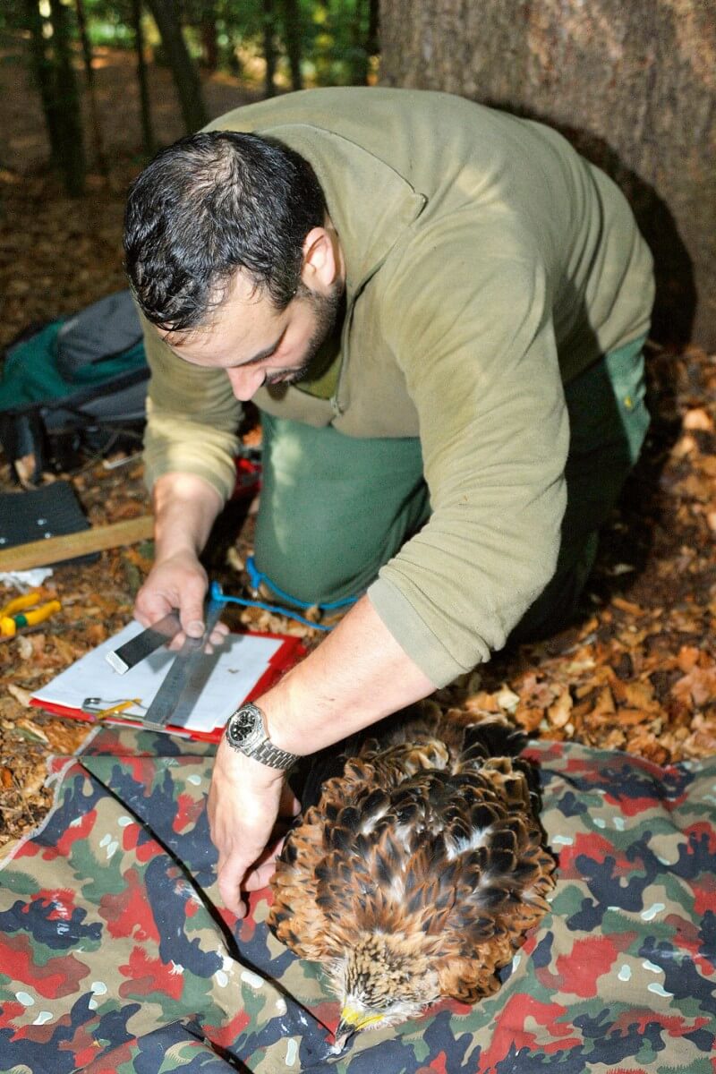 Nous avons profité de notre présence sur place pour baguer aussi l'unique jeune d’un couple de milans royaux dont le nid est situé à seulement 16 mètres de l'aire des milans noirs.