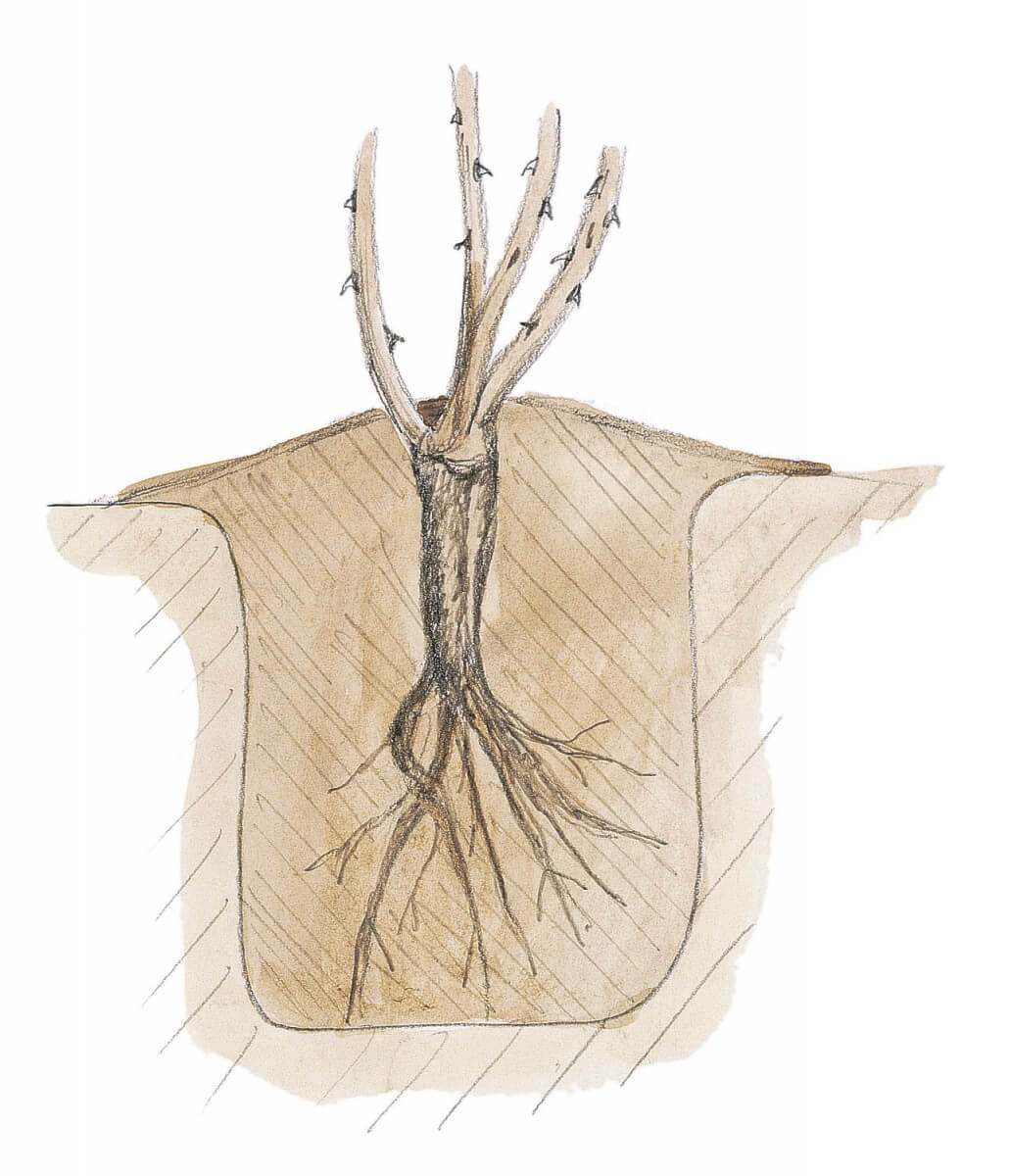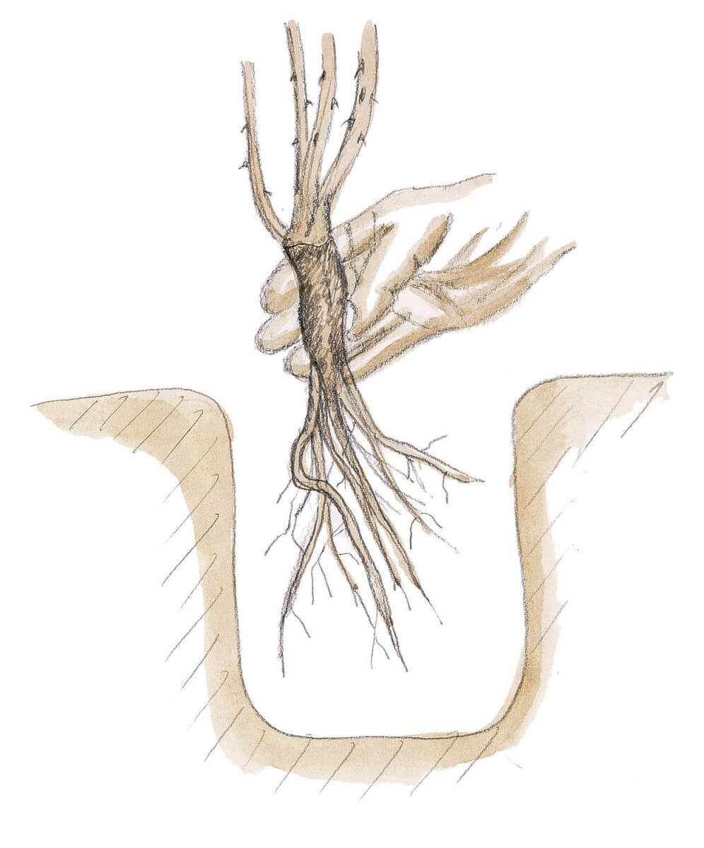 Dès réception du rosier, trempez-le dans l'eau pendant 2 heures après avoir retaillé un peu les racines. Creusez un trou dont le volume est de 30 % supérieur à celui des racines.