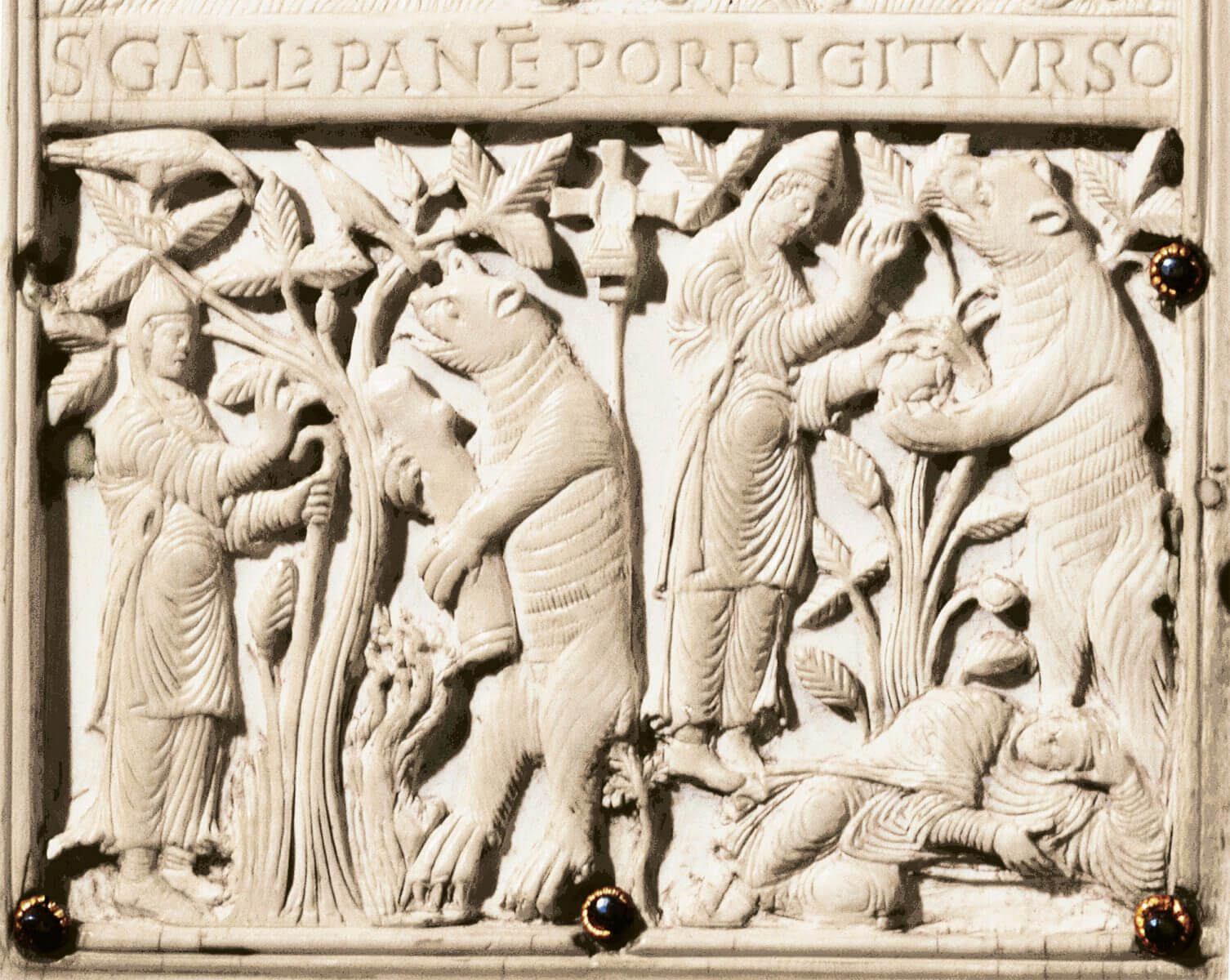A côté de ces destructions directes, l’Eglise s’évertue à faire descendre l’ours de son trône. Les récits de la vie des saints en offrent un premier moyen. On met en scène des personnages qui soumettent l’animal. Ainsi saint Gall, moine irlandais parti convertir un territoire aujourd’hui situé à l’est de la Suisse, se rend-il maître d’un ours qui tentait de s’emparer de sa nourriture. Puis le saint, avec l’aide de l’animal, construit un ermitage, qui deviendra une puissante abbaye. On l’aura compris : le saint, c’est la suprématie chrétienne, et l’ours, le culte païen qui se soumet.