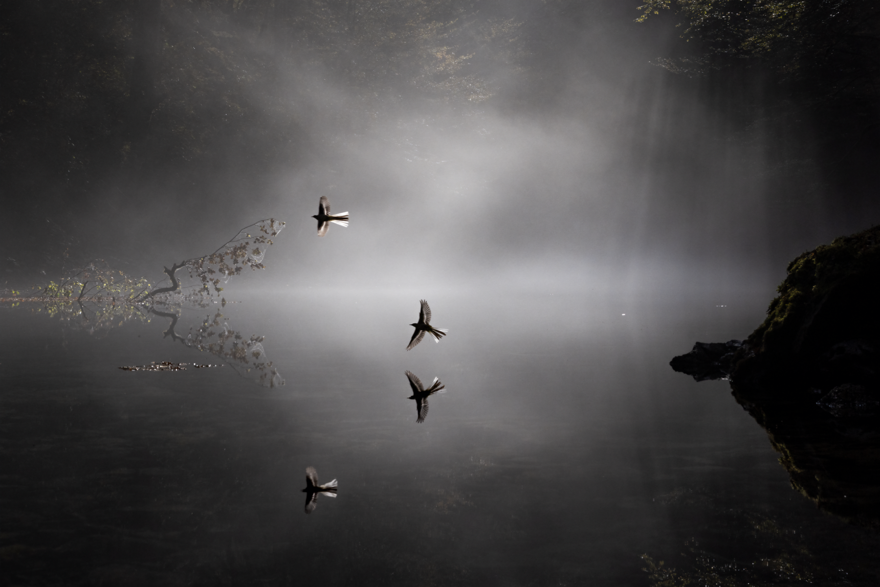« Omniprésents et éternels, certains passereaux perdurent. Puisqu’ils vivent avec nous toute l’année, il serait dommage de ne pas saisir l’occasion de les représenter sous un nouveau jour. L’automne dernier, j’ai capturé l’ombre d’une mésange charbonnière à Bydgoszcz (Pologne), tandis qu’elle se nourrissait de petits invertébrés dans les branches d’un érable dans mon jardin. Araignées, prenez garde ! »