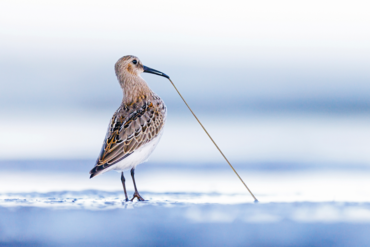 « Pendant la migration automnale, des milliers d’oiseaux de rivage font escale le long de la côte baltique pour se ravitailler. Les bécasseaux variables utilisent leur long bec pour extraire les vers de vase enfouis profondément dans le sable. Parfois, le ver sort facilement, d’autres fois, la scène ressemble à un véritable bras de fer. Cette photo immortalise les efforts et la détermination de l’oiseau qui finit par obtenir son en-cas riche en énergie. »