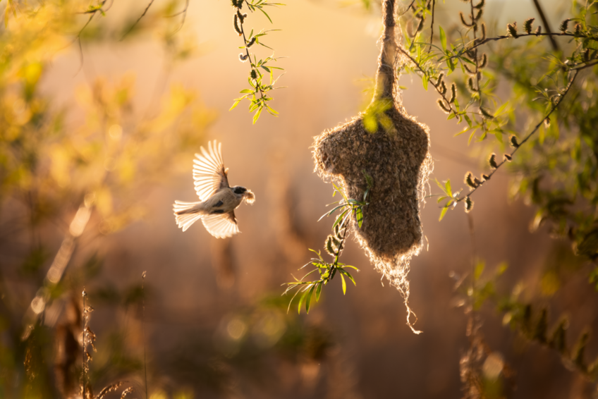 « La photo montre une rémiz penduline qui apporte des matériaux pour son nid. En Pologne, leur nombre diminue en raison de l’agriculture et de l’abattage des saules, ce qui rend ces nids suspendus de plus en plus rares. J’ai eu la chance de m’approcher d’eux avant le lever du jour, dissimulé pour ne pas les déranger. Les oisillons sont parvenus à l’envol en toute sécurité, et j’espère que ces images mettront en valeur leur fragile beauté. »