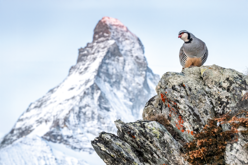 « J’en ai rêvé : le Cervin, emblème de la Suisse, et une perdrix bartavelle. Au printemps, les coqs donnent de la voix sur des promontoires. Tout devait être parfait, et c’était le cas ce matin-là. Au sommet de son caillou, il a chanté comme s’il était seul au monde. Caché dans mon affût, appareil photo en place, j’ai enfin pu mettre de côté les déceptions des années passées. »