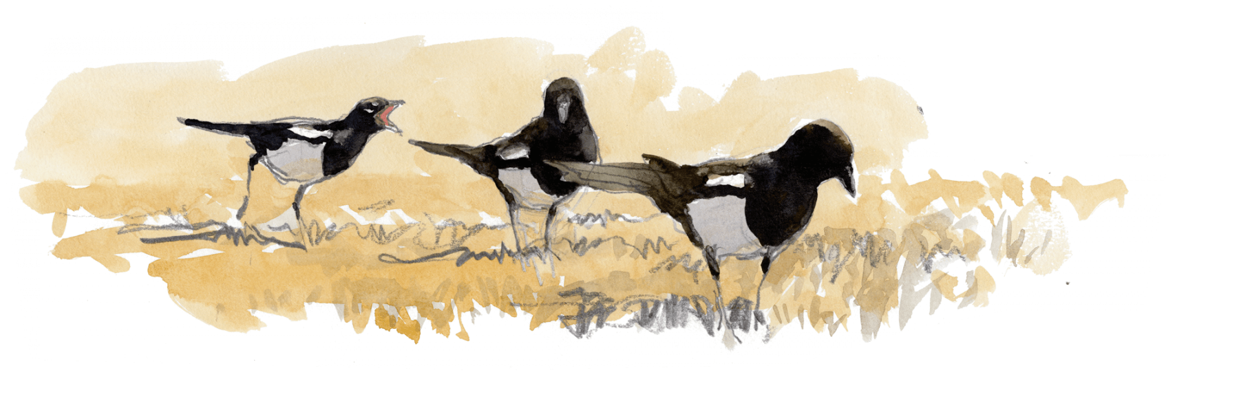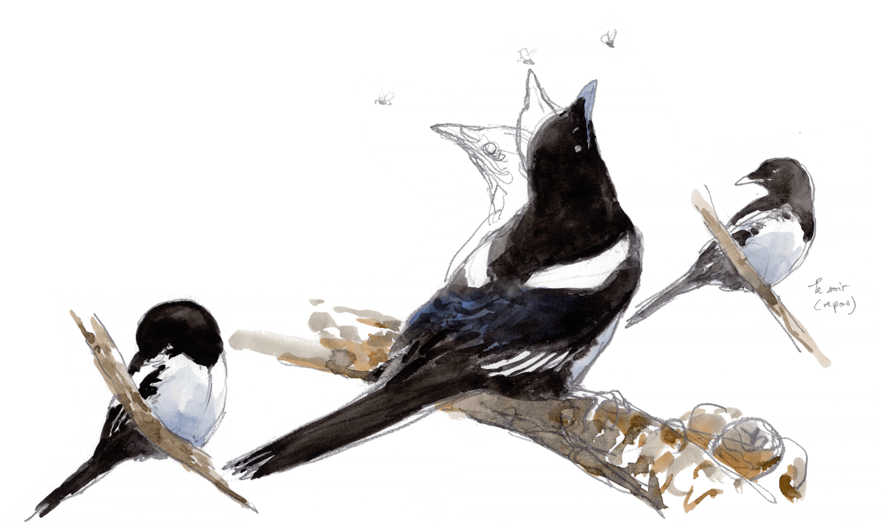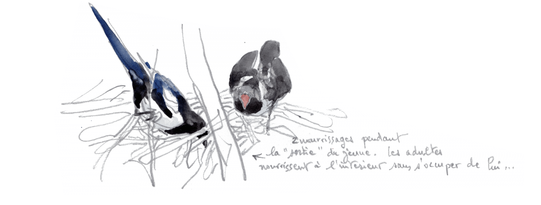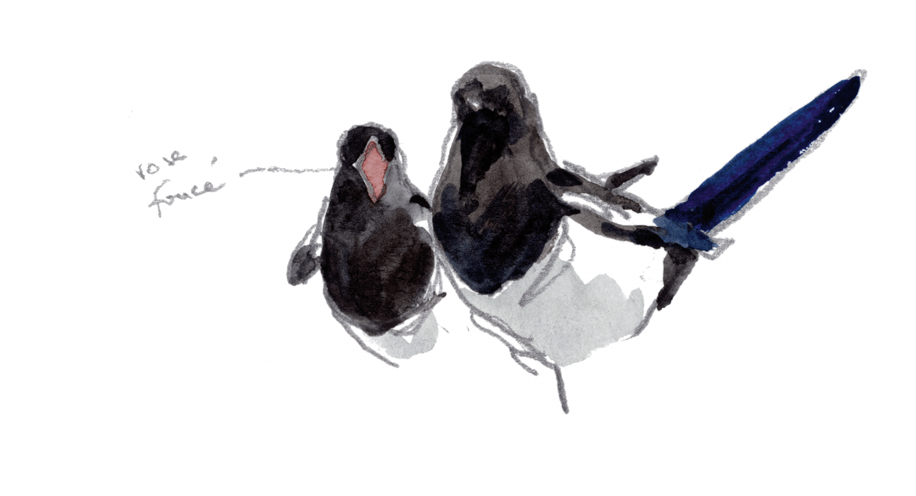 Le temps des becquées se termine environ un mois après l’envol. Mais les jeunes resteront avec leurs parents quelques semaines encore, le temps d’apprivoiser les dangers de la vie. « Chaka-chaka-chaka, jacasse Christoph Vogel. Au moindre danger, les adultes poussent ce rappel à l’ordre typique. » L’un des cris d’oiseau à la fois les plus familiers et maudits. N’y voyez pas de messages codés ou la trame d’un complot pour voler des œufs dans un poulailler. Ce staccato exprime simplement l’inquiétude de l’agasse. « Un chat, un épervier ou l’arrivée du facteur suffit à déclencher ces vocalises. » Et comme les pies sont des parents très attentionnés et prévenants, ça jase tout le temps.