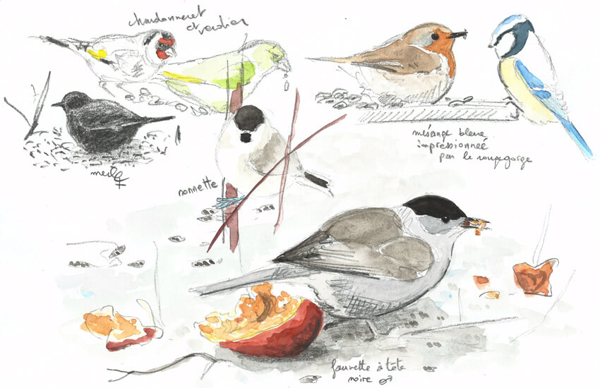 C’est le grand départ de Mon voyage au jardin ! Il a encore fait -10°C cette nuit. Déjà onze jours de neige au sol. C’est décidé, l’aventure commence près de la mangeoire. Une foule nombreuse s’y côtoie par nécessité et chacun tolère la promiscuité pour bénéficier de la nourriture et de la sécurité qu’elle apporte. Cette mixité vertueuse ne se passe pas pour autant sans heurts car l’hiver provoque une tension palpable. Il faut survivre.