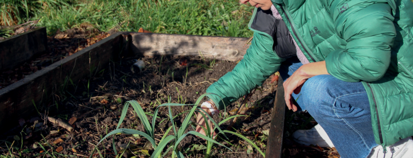 Plus loin, un panneau annonce les lopins de jardins individuels. Les surfaces accordées aux habitants varient de 3 à 24 m2. Au passage, Hélène enlève quelques herbes de la terre froide où poussent ses poireaux.