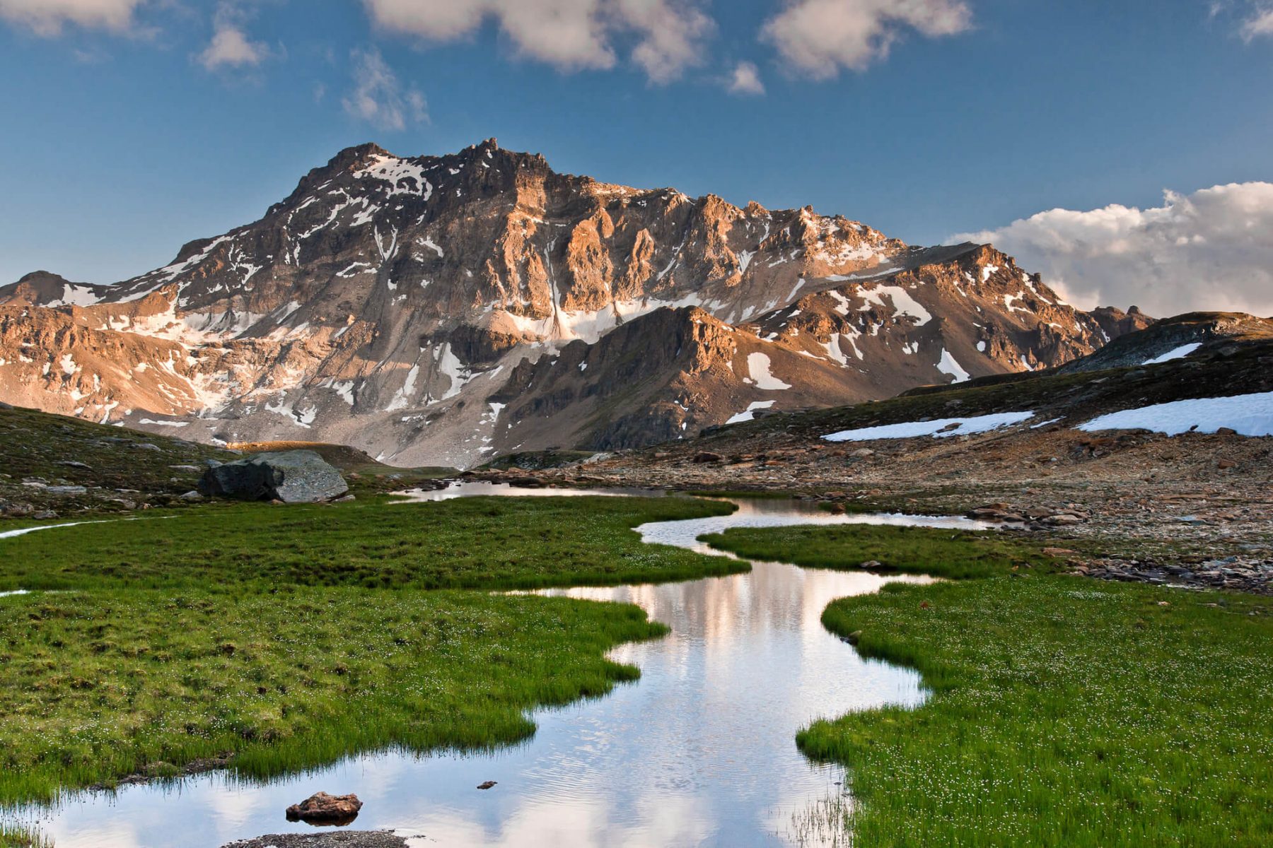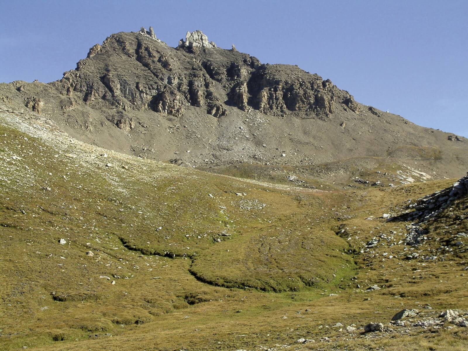 Quelques mètres après le col, un névé large comme un cachalot recouvre le sentier qui amène à un lac, puis à des méandres bleus et à des petits marais verts. On trouve là quelques discrètes raretés, des herbes d'origine arctique que des botanistes passionnés viennent contempler, parfois de très loin.