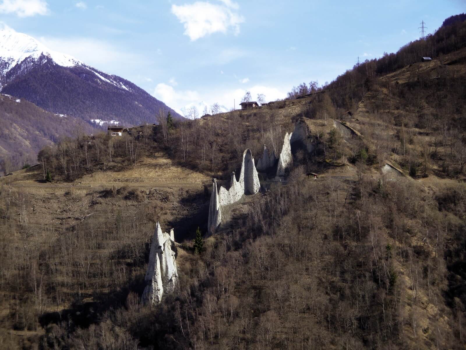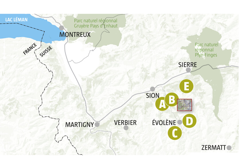 A) Pyramides d'Euseigne La route principale qui remonte le Val d'Hérens en direction d'Evolène passe à travers un petit tunnel sous l'une des plus spectaculaires curiosités géologiques de la chaîne alpine : des pyramides constituées par érosion d'anciennes moraines formées durant la dernière glaciation. Petit à petit, la roche friable a disparu, sauf sous quelques gros blocs de pierre qui coiffent et protègent ces « cheminées de fées ».