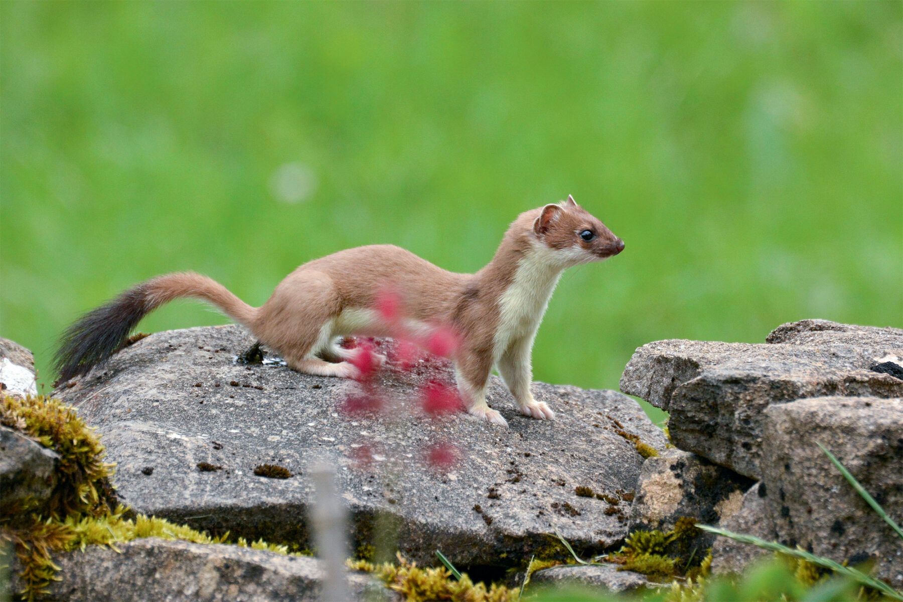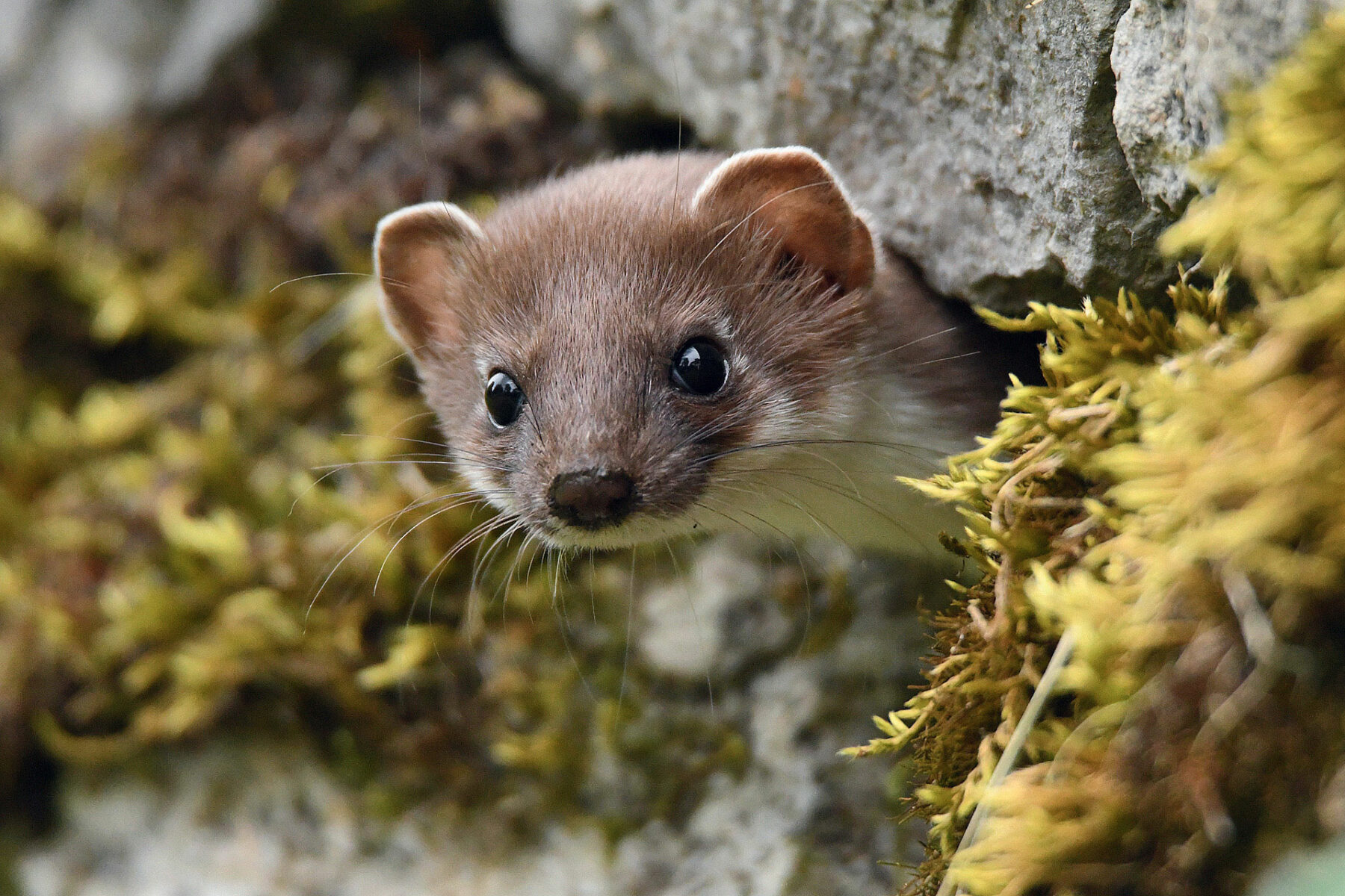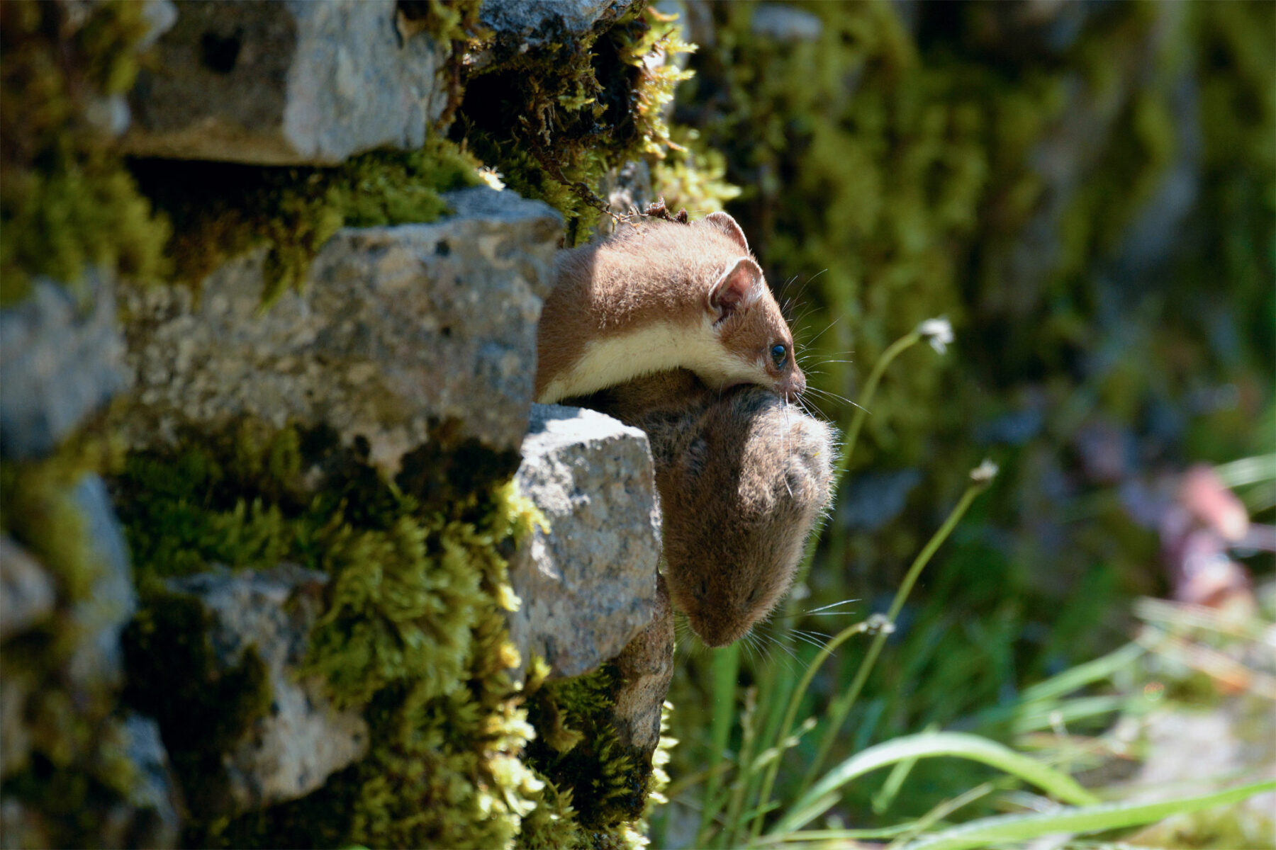 Alors que je marche d’un bon pas sur un petit sentier, mon élan est stoppé net par une hermine qui me coupe la route avant de disparaître dans un tas de pierres, un énorme campagnol dans la gueule.