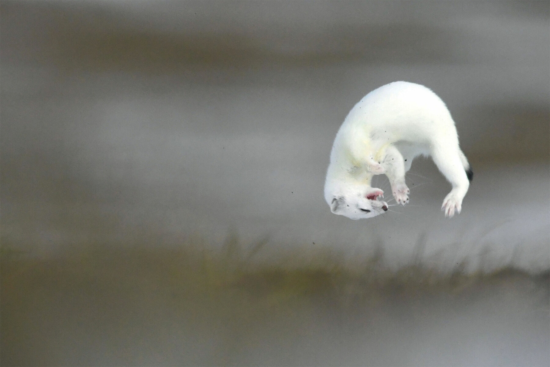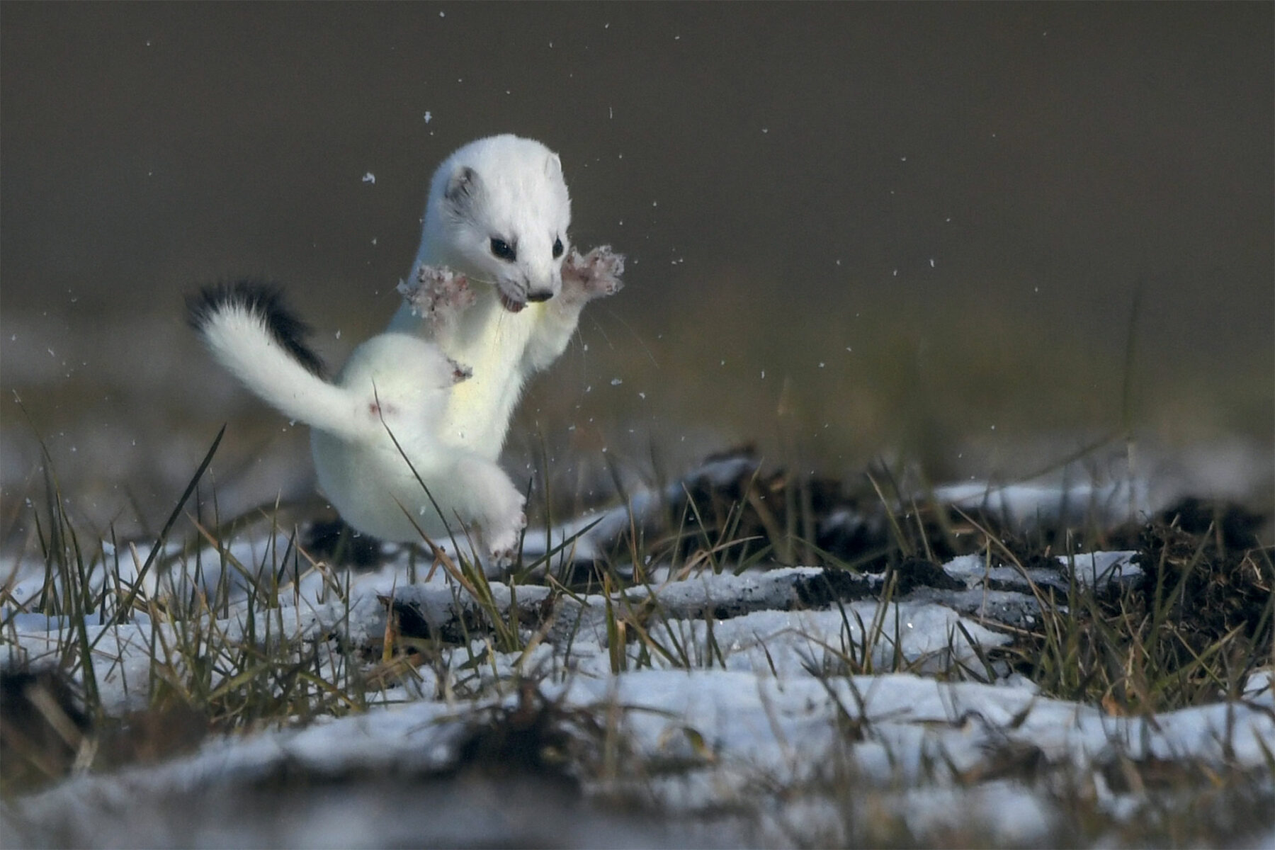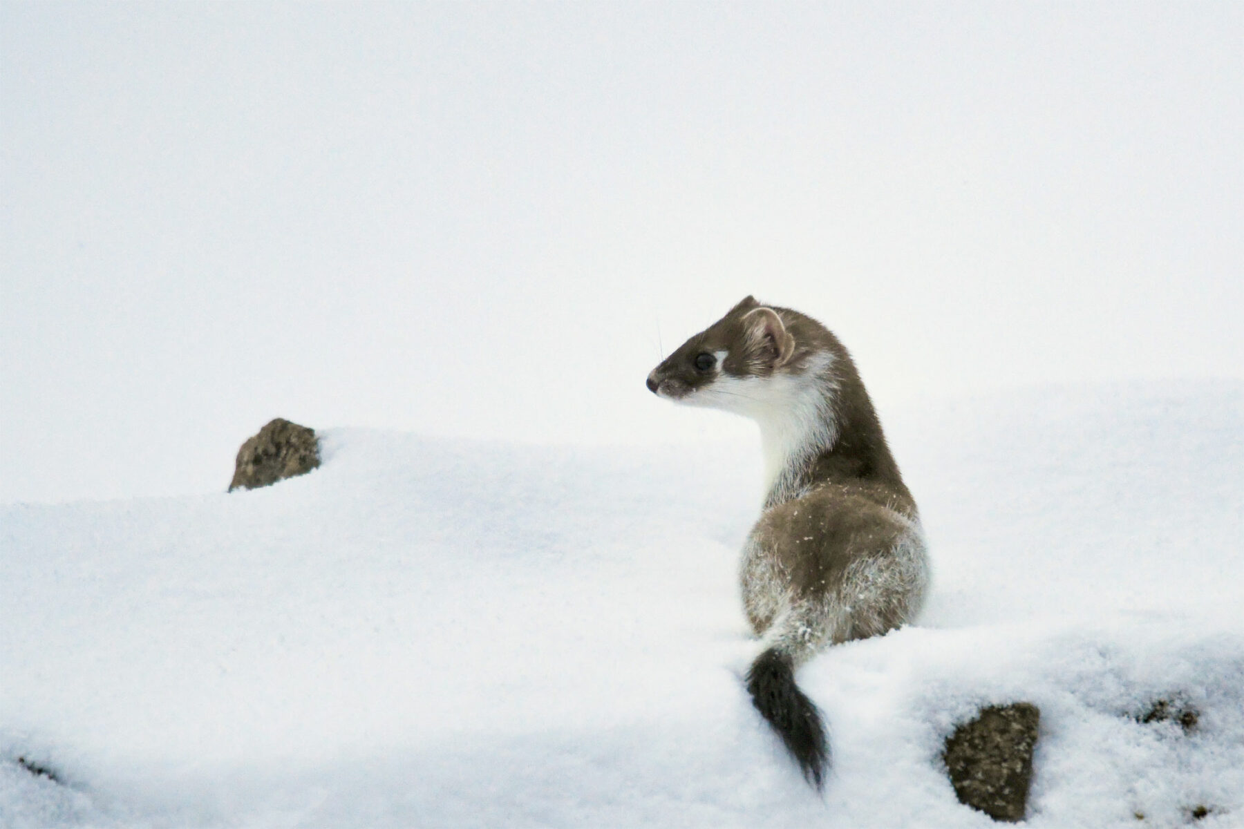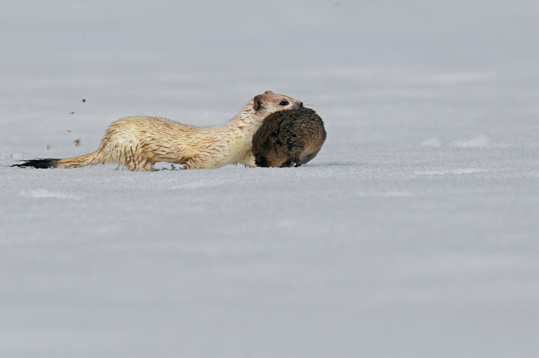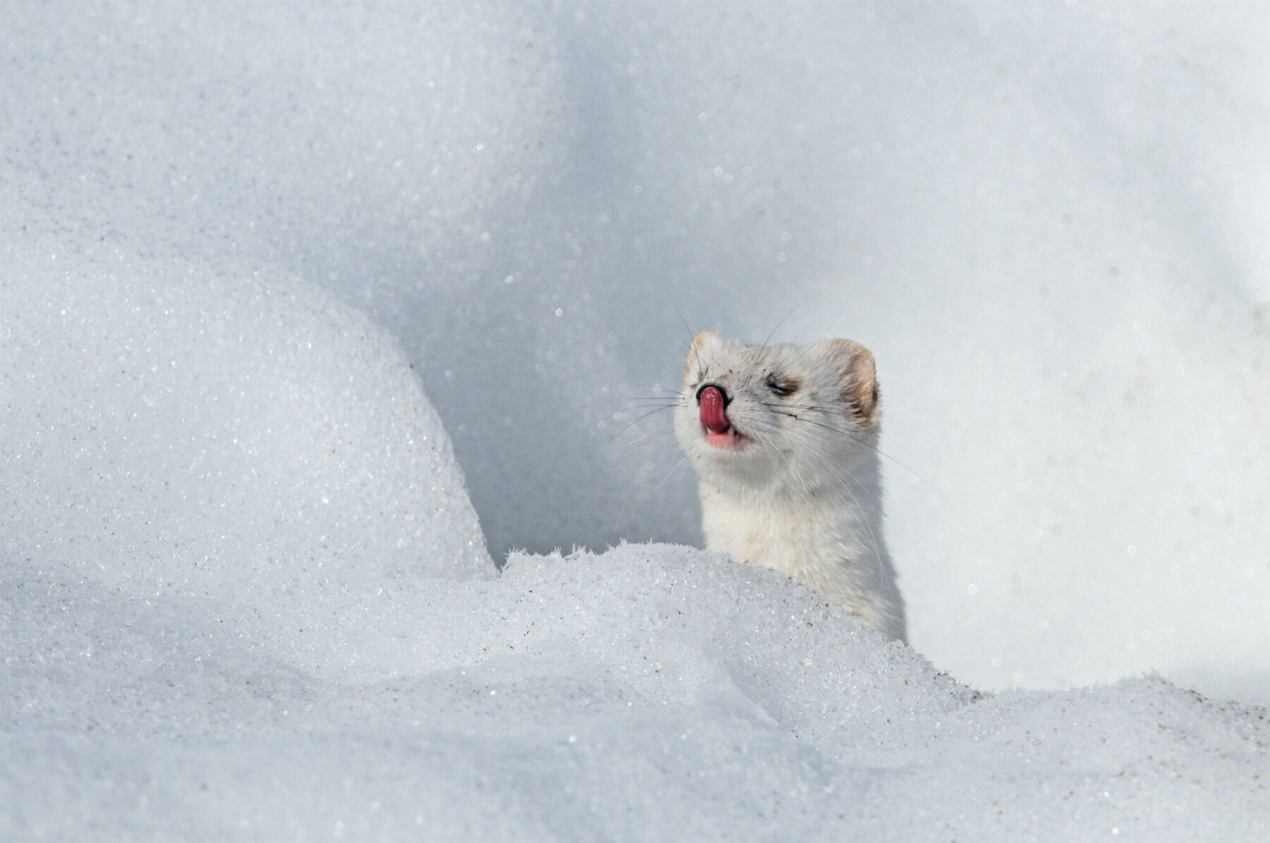 Il est à peine 8 h quand je vois disparaître une petite queue blanc et noir derrière une épaisse congère. J’ai bien fait de sortir, malgré le froid mordant ! Sans tarder, je m’allonge à plat ventre dans la poudreuse et j’attends. Dix minutes plus tard, surprise ! Un autre bolide blanc déboule sur ma droite, puis un troisième apparaît à ma gauche, tandis que la première ressort d’un trou quasiment sous mon nez.