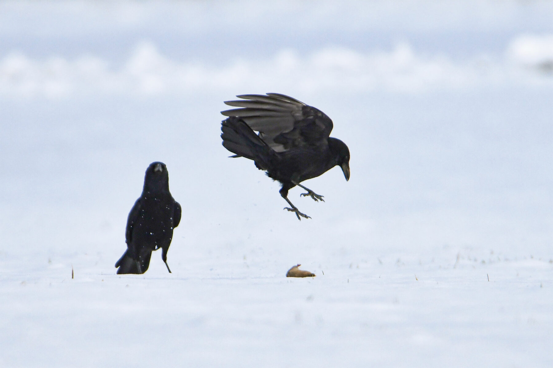 Quelques secondes plus tard, le petit mustélidé ressort de son trou et se met à courir comme un fou autour du rapace. Mais voilà que deux corneilles débarquent à leur tour et commencent à harceler la buse, qui finit par leur céder les restes du pauvre rongeur. L’hermine, voyant son repas dérobé une seconde fois, disparaît.