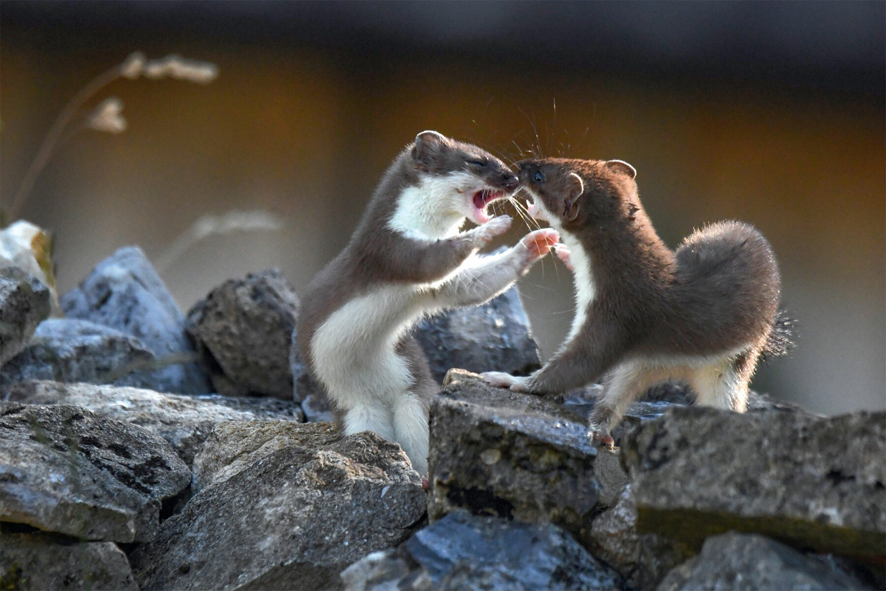 Soudain, une nouvelle hermine surgit à quelques mètres. Vu sa grande taille, c’est un mâle. Immédiatement, les jeunes se réfugient dans leur abri. Au même instant, leur mère déboule comme une flèche et se jette sans préambule sur l’intrus. Les voilà lancés dans une lutte fulgurante, formant une boule trépidante de corps entremêlés. Rapidement, le gaillard se dégage et bat en retraite. Il a beau être plus costaud, il ne peut rivaliser avec la fougue de l’occupante légitime des lieux.