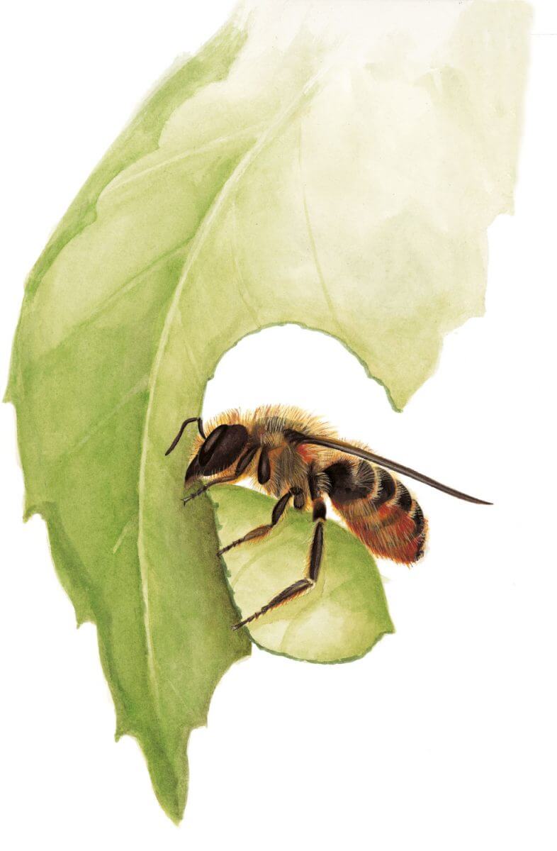 Le truc de terrain : En mai ou en juin, cherchez des trous d’environ un centimètre sur des feuilles de rosier : la mégachile n’est pas loin ! Forez des trous de différentes tailles dans une vieille bûche. L’abeille y construira peut-être ses étuis de feuilles. L’observation des allers et retours de l’insecte chargé de tuiles vertes, puis de pollen, est un vrai régal.