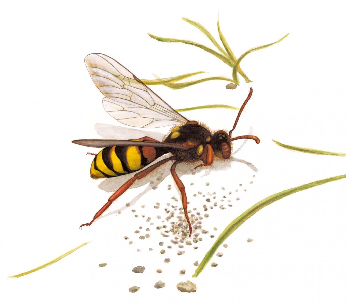 L’abeille-coucou Nomada est un parasite. Au lieu de récolter du pollen pour sa descendance, elle a développé un lien particulier avec notre andrène. Prudente, l’abeille des sables ne quitte jamais son nid sans en fermer l’entrée.